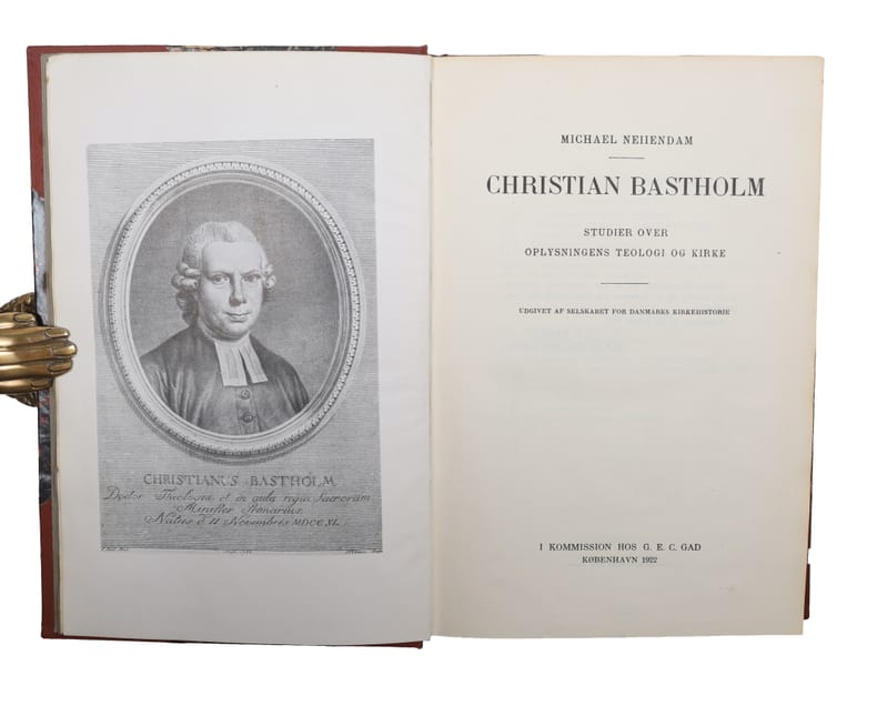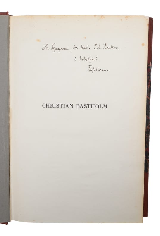 København, G.E.C. Gad, 1922. 8vo. Indbundet i et simpelt, samtidigt halvshirtbind med forgyldt rygtitel. Med egenhændig dedikation på fribladet til ""Hr. Sognepræst, Dr. theol. P.A. Becker"". Enkelte spredte brunpletter og understregninger. Med frontispieceportræt af Bastholm. 457 pp.