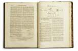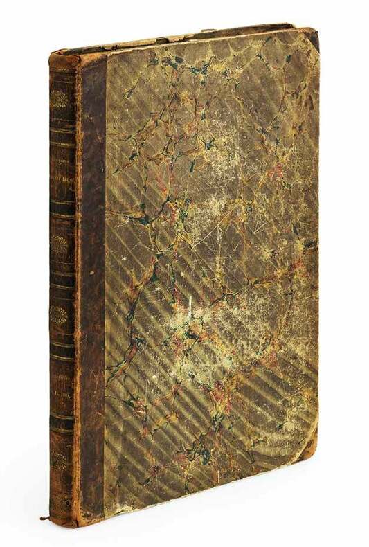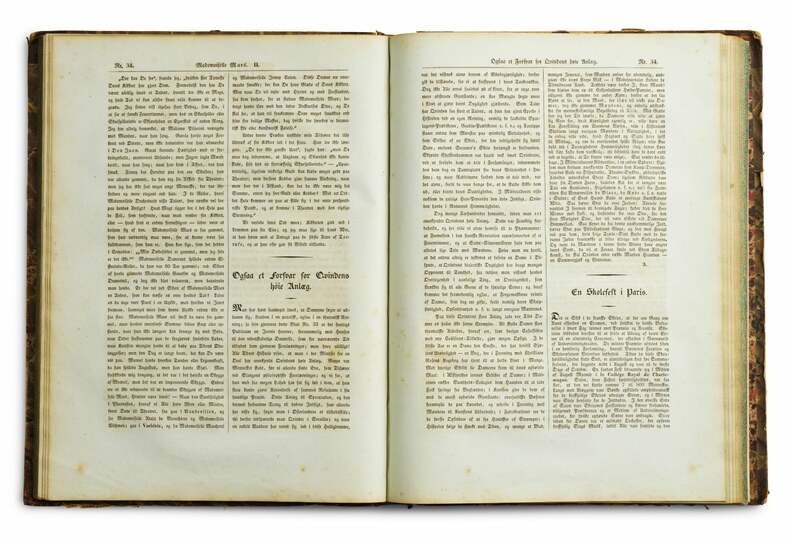 Kjøbenhavn, 1834-1836. Large 4to. Interimsblade [i.e. Interim Papers] 1-100, with the joint title-page and the contents leaf, bound in a very nice contemporary brown half calf with gilt spine and marbled paper over boards. Spine with wear and hinges and corners bumped. Edges of boards with wear. Occasional brownspotting throughout, but all in all a fine and well preserved copy. Each “Interimsblad” takes up 4 pp. Kierkegaard’s contributions: I: ab. 1 p. II: 2 3/4 pp. III: 4 pp. IV: 4 pp.