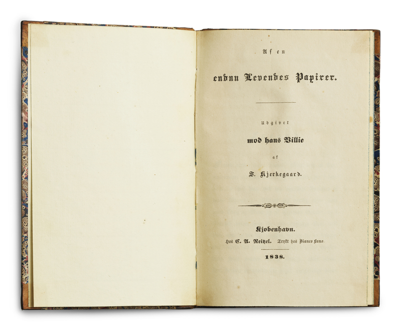 An exquisite copy of the first edition of Kierkegaard's first work, which has belonged to Kierkegaard’s disabled cousin, who was a great source of inspiration to Kierkegaard. The relationship between the two cousins was very touching, and they both benefitted greatly from the other. Søren drew inspiration from his cousin, who was lame and unable to walk, and he cared a great deal for him. Hans Peter was one of the very few who had a standing invitation to visit Søren. He felt that his cousin might lead a truer and more meaningful life than most other people, who do not face the same hardships. Hans Peter, on the other hand, was greatly comforted by his famous cousin and his edifying writings. Søren helped him feel that, in spite of his hardships, his life was not wasted – he helped him believe in God. All copies of Kierkegaard’s works belonging to his cousin denote a special significance, but it is especially lovely to find H.P. Kierkegaard’s copy of his cousin’s very first book. Kierkegaard's famous first work sews the seeds of his future career and initiates his philosophical production. It is in this famous review of Hans Christian Andersen as an author of novels, with a particular focus on his Only a Fiddler that Kierkegaard – the then 25 year-old theology student known only in a small academic circle, for his wit and sharp intelligence – puts forth his devastating criticism of Hans Christian Andersen – then 33 years old and already widely famous, Denmark’s other national hero and world-famous fairy tale-author. Even though the book is written as a polemic review, we already here witness Kierkegaard’s introduction of his emphasis on authentic individual existence will continue throughout his entire production as thus, From the Papers of one Still Living serves as a highly important introduction to Kierkegaard’s philosophical-ethical production. Kierkegaard points out that Hans Christian Andersen has not yet found himself and therefore cannot be a good author. This emphasis on authenticity and on the necessary first stage of the epic becomes an introduction to Kierkegaard’s famous theory of stages that he develops in his later works. He rejects the notion that environment is decisive in determining the fate of genius – the genius is a shaping subject, not a passive one formed by circumstances. Not one that needs to be nurtured and sheltered in order not to perish. The work was originally meant to be published as an article in the literary periodical Perseus, of which Johan Ludvig Heiberg was the editor. But the article grew too extensive, and the intended columns in the periodical were given to H.L. Martensen instead. Martensen’s article took up 70 pages and was about the idea of Faust, which vexed Kierkegaard, who had wanted to write about that subject himself. Kierkegaard, Hans Peter (1815-62) is always referred to as Kierkegaard’s cousin, also by Kierkegaard himself, but if one is to be precise, he was Søren’s half-cousin. H.P. was the son of M.P. Kierkegaard’s (Søren’s father) cousin, M.A. Kierkegaard. H.P. was one of the few people Kierkegaard was personally very close to. As Søren writes in a letter to H.P. (SKS letter no. 27) “you are one of the exceptions”. He cared a great deal for his cousin, who was disabled. He was lame, completely paralyzed on one side of the body, and unable to walk. Intellectually, however, he was gifted, and the two cousins grew very close. Søren saw in him a purity that he did not see in other people, an ability to lead a truer and more meaningful life than others, who did not have to suffer in the same way. Søren was also a great comfort to H.P, who read the works of his famous cousin with enthusiasm. He probably owned every single work Kierkegaard wrote, and he drew great comfort from several of them. As Brøchner recalls in his recollections about Kierkegaard (Erindringer om Søren Kierkegaard – no. 43), H.P. “read his cousin’s writings with the greatest of interest, occasionally visited him in his home, and drew much spiritual awakening from these visits.” Brøchner continues to recall how he once told Kierkegaard what a great impression one of his works, Opbyggelige Taler i forskjellig Aand, had made upon H.P. In the confessional discourse, Søren portrays a person, who due to his bodily disposition is unable to practice anything physically or outwardly, and goes on to beautifully describe how this person too is subject to the same ethical demands as everyone else and what particular form this life-assignment takes on for him. To this, Søren replied “yes! To him, that work is a blessing”. And so it was. Reading his cousin’s upbuilding works provided the disabled Hans Peter with the power to overpower gloomy thoughts about his life having no meaning. Søren gave him, not only through his writings, but also through his meetings and conversations with him, the feeling of being as important as everyone else, as those who were physically blessed. There is no doubt that Kierkegaard drew inspiration from his admirable cousin, who had to overcome so much. And there is no doubt that H.P. was close to Søren’s heart. Apart from Boeson, H.P. was the only person who had a standing invitation. He writes how he admires H.P., who, reconciled with his fate, with patience and devotion solves a task that is just as great as the one everyone else has to solve, whether they do big business, build houses, write great books, etc. – “when all is heard, everything, after all, mainly comes down to fervor – and when all is forgotten, it also comes down to fervor” … “Do not forget the duty to love thyself… That you are somehow set outside of life… that in the eyes of a stupid world, you are superfluous, let that not rob you of the idea of yourself.” (Letter 27). Like his famous cousin, H.P. Kierkegaard was also a bibliophile and had a beautiful book collection. The books that surface from hi
