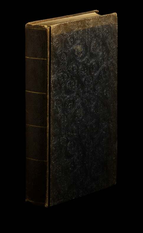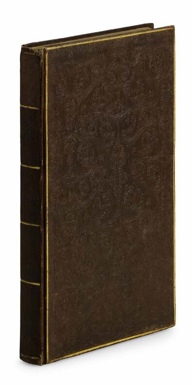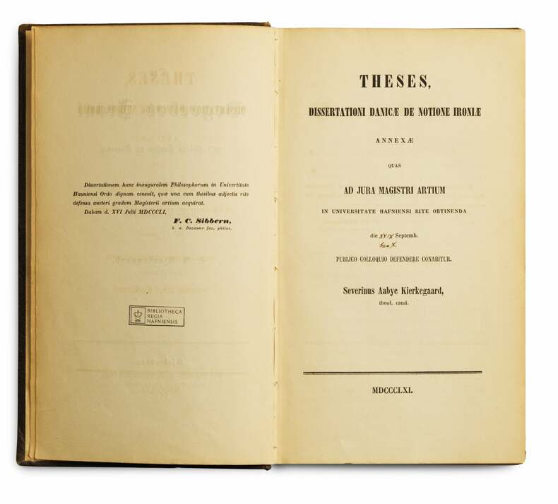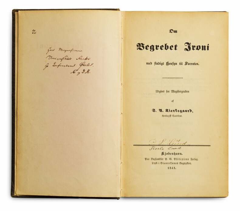 Kjøbenhavn, P.G. Philipsens Forlag, 1841. 8vo. (8), 350 pp. Gift binding of elaborately blindpatterned full cloth with single gilt lines to spine. All edges gilt and printed on thick vellum paper. A splendid copy in completely unrestored state with minimal edge wear. Slight sunning to upper 1 cm of front board and slight bumping to corners and capitals. Leaves completely fresh and clean. Pencil-annotation from the Kierkegaard archive of the Royal Library (nr. 83) and discreet stamp from the Royal Library of Copenhagen to inside of front board (with a deaccession-inscription) and to verso of title-page. With ownership signatures of P.S. Lund and Troels Lund to title-page. Inside of back board with previous owner’s pencil-annotations listing the entire provenance of the copy and explaining that this is one of two copies printed on thick vellum paper. Laid in is the original agreement for the exchange of real property between the previous owner and the Royal Library of Denmark, from which is evident that in 2003, The Royal Library and the previous owner legally agreed to exchange their respective copies of Om Begrebet Ironie – the present one for Ørsted, being one of two copies on thick vellum paper, and the copy on normal paper for Heiberg, which is now in the holdings of the Royal Library of Denmark.