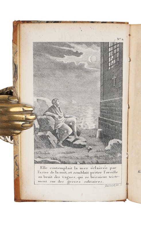 Bruxelles, Arnold Lacrosse, 1820. 12mo. (135 x 85 mm). Bound in 5 beautiful contemporary sprinkled half calf bindings with richly gilt spines. Gilt title- and tome labels to spines. Boards rubbed. Upper capitals of vol. 3 and 4 with loss. Slight wear to edges of boards. Significant brownspot, causing slight loss of paper and text to pp. 261-69, vol. 3. Evenly browned, otherwise internally clean. Four engraved frontispieces and three in-text engravins.