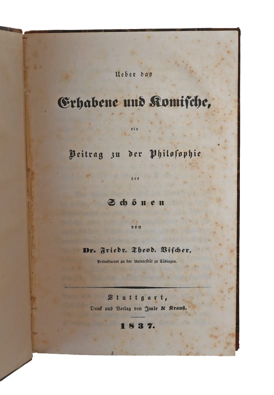 The uncommon first edition of the important and controversial Heglian philosopher’s Habilitation work. Von Vischer (1807-1887) was a literary critic and aesthetic philosopher primarily famous for his efforts to create a theoretical basis for literary criticism, but also for his controversial ideas and outspokenness. Having been elected full professor at Tübingen in 1845, Vischer gave a candid lecture, in which he admitted to being a Pantheist. This caused quite a scandal and resulted in him receiving a two-year teaching ban. In 1848, he took part in the March Revolution and entered Frankfurt Parliament as a member of parliament for the Democratic Left, as a moderate left-winger. His two-volume collection of political essays Kritische Gänge (1844) was placed on the Index. “Vischer’s theories of aesthetics, based on ideas of G.W.F. Hegel, began to develop while he was teaching at the University of Tübingen, where he had studied. He became a professor at Tübingen in 1844 but was suspended for two years because of an outspokenly liberal inaugural address... In 1855 he became professor at Zürich, but he returned to Tübingen in 1866.