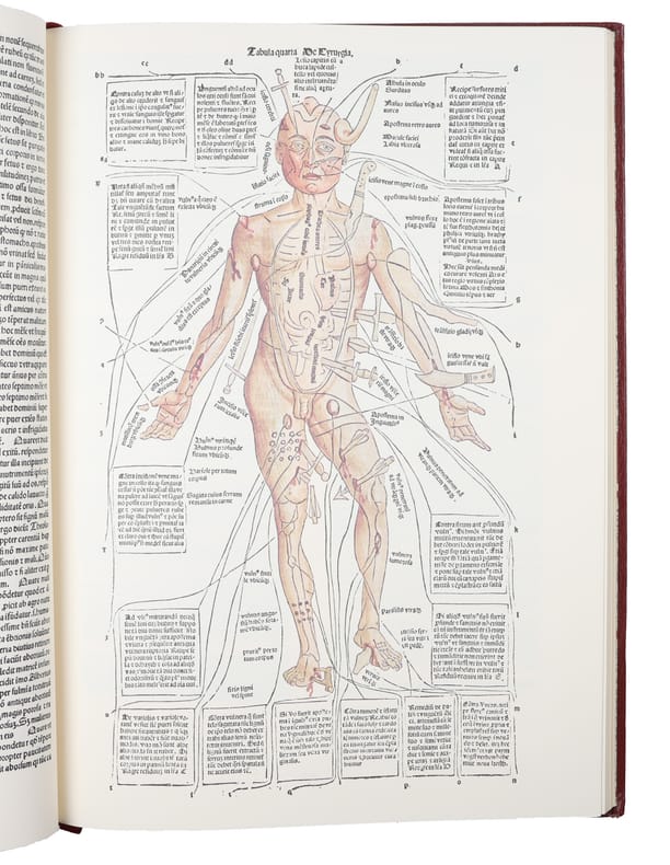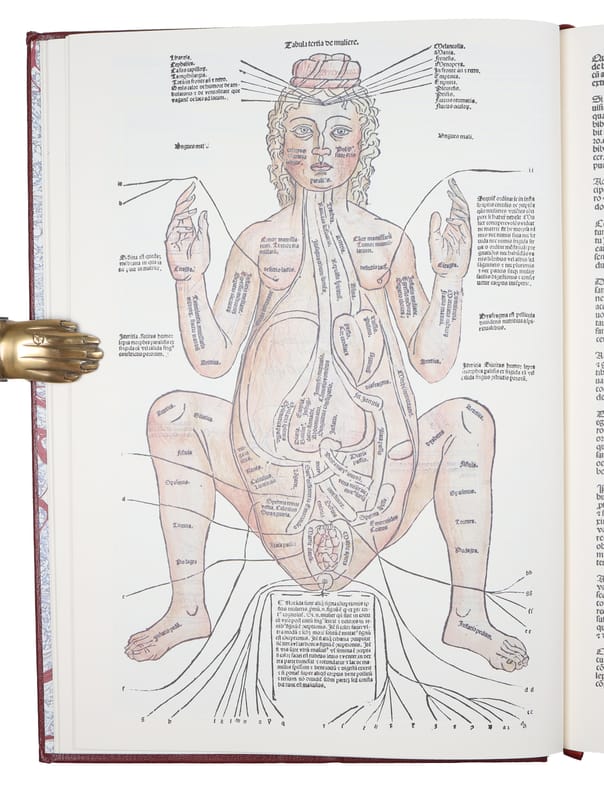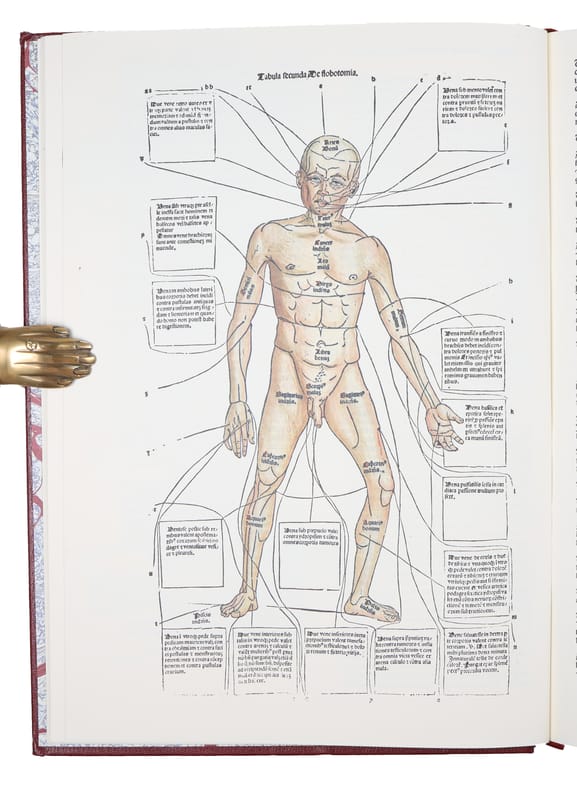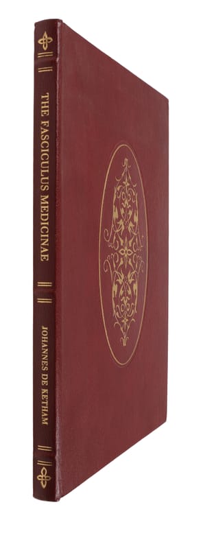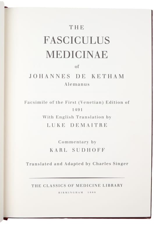 Birmingham, The Classics of Medicine Library, 1988. Folio. Full immitated red leather with large gilt centre-ornamentations to boards and gilt lettering to spine. All edges gilt. A bit of wear to corners, otherwise nice, clean, and fresh, also internally. Marbled end-papers. (10), 100 pp. + (1), 8 (plates, two folded) ff. + pp. (115)- 128 (Appendix) + 2 ff. Nr. 355, in the Library of Dr. Ian W. Mahady.