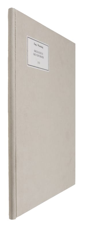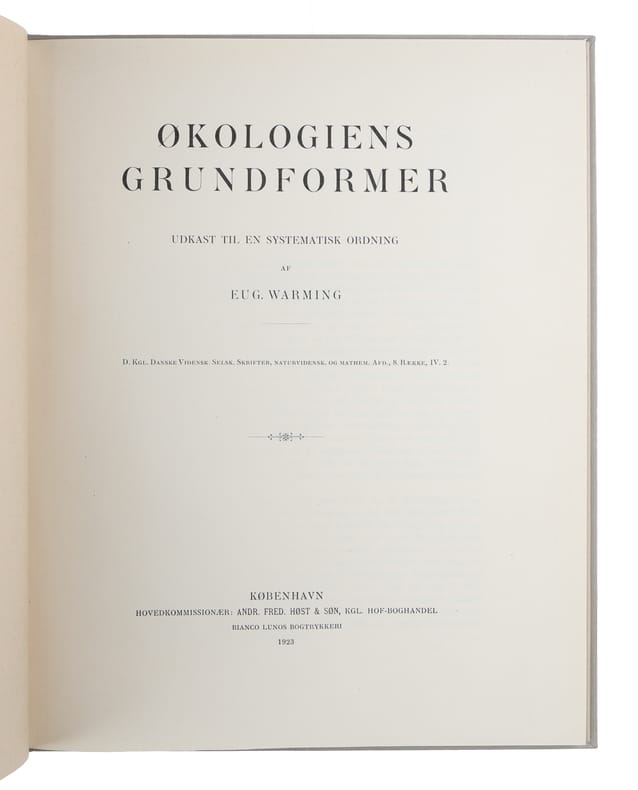 First edition. Johannes Eugenius Warming (1841–1924), commonly known as Eugen Warming, was a pioneering Danish botanist widely recognized as one of the founding figures of modern ecology. He authored the first textbook on plant ecology in 1895, introduced the first university course in the subject, and helped define the scope and content of ecological science. In 1975, ecologist R. J. Goodland asserted: “If one individual can be singled out to be honoured as the founder of ecology, Warming should gain precedence” (""The Tropical Origin of Ecology: Eugen Warming's Jubilee""). Warming wrote a number of textbooks on botany, plant geography and ecology, which were translated to several languages and were immensely influential at their time and later. Most important were “Plantesamfund and Haandbog i den systematiske Botanik”.