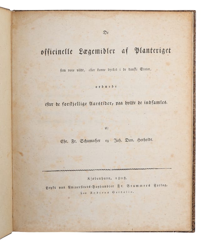 The rare first appearance of Schumacher's work on botanical medicines, which either grow wild or could be cultivated in Denmark, sorted by season of harvest.Heinrich Christian Friedrich Schumacher (1757 - 1830) was a Danish surgeon, botanist and professor of anatomy at the University of Copenhagen. Schumacher made significant research work in malacology and described several taxa.