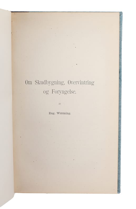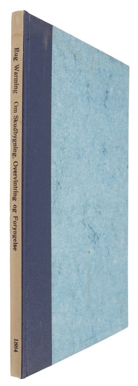 Rare first edition of Warming's first attempt in life-form classification. The work is considered foundational for later developments in plant ecological morphology and life-form classification, and it laid important groundwork for Warming’s more famous 1895 textbook ""Plantesamfund"" which helped establish ecology as a scientific discipline. The classification was based on his meticulous observations while raising wild plants from seed in the Copenhagen Botanical Garden. Fourteen informal groups were recognized, based on longevity of the plant, power of vegetative propagation, duration of tillers, hypogeous or epigeous type of shoots, mode of wintering and degree and mode of branching of rhizomes. Johannes Eugenius Warming (1841–1924), commonly known as Eugen Warming, was a pioneering Danish botanist widely recognized as one of the founding figures of modern ecology. He authored the first textbook on plant ecology in 1895, introduced the first university course in the subject, and helped define the scope and content of ecological science. In 1975, ecologist R. J. Goodland asserted: “If one individual can be singled out to be honoured as the founder of ecology, Warming should gain precedence” (""The Tropical Origin of Ecology: Eugen Warming's Jubilee""). Warming wrote a number of textbooks on botany, plant geography and ecology, which were translated to several languages and were immensely influential at their time and later. Most important were “Plantesamfund and Haandbog i den systematiske Botanik”.