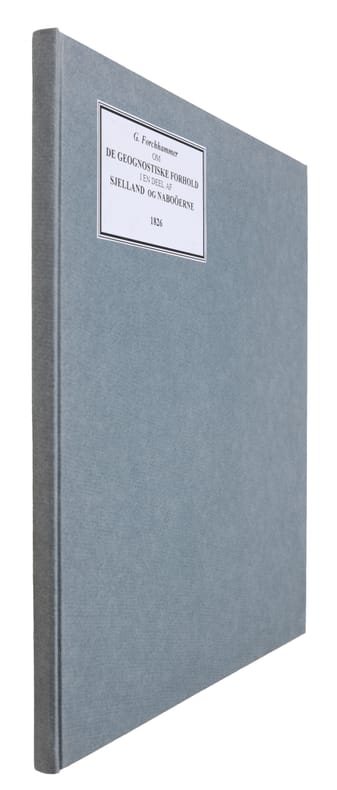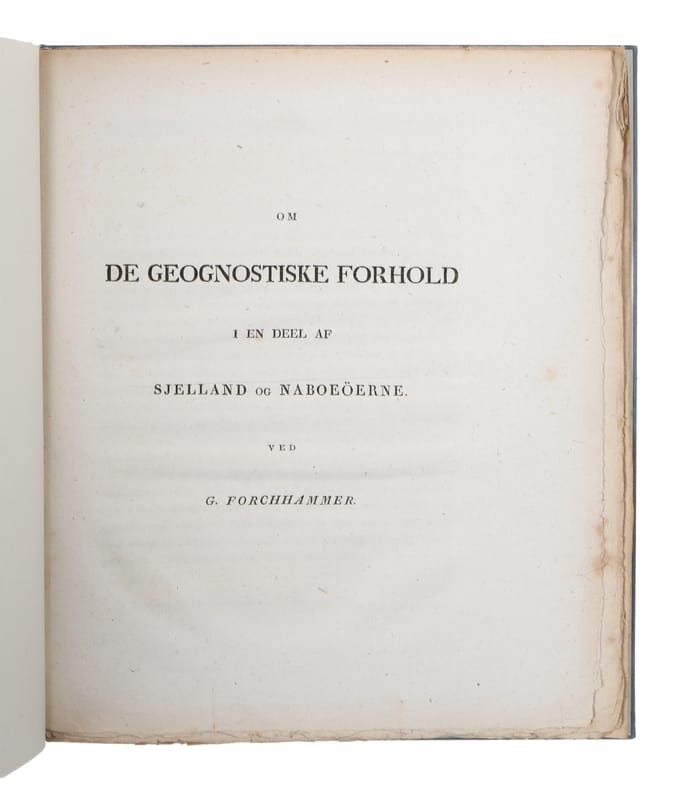 First edition of Forchhammer's important work where the Zealand ""chalk"" is examined - in Faxe, on Møn, etc. - and the rock types are differentiated and classified, including the now-famous layer containing the fish clay.