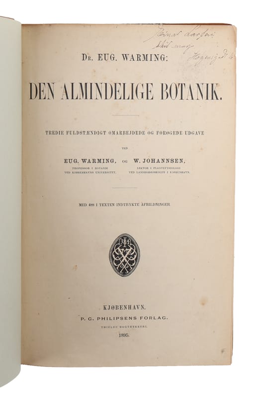 Kjøbenhavn, Philipsens Forlag, 1895. 8vo. Bound in a nice recent half calf with gilt lettering to spine. Previous owner's name (Einar Larsen, Danish botanist) to top of title-page. With numerous pencil-underlignings throughout. (8), 595, (1) pp.