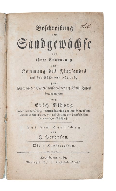 First German translation of this price winning treatise which became the scientific foundation for Christian VII's 1792 ordinance concerning the suppression of sand drift which for centuries had been a scourge over large stretches of the coast of Jutland.