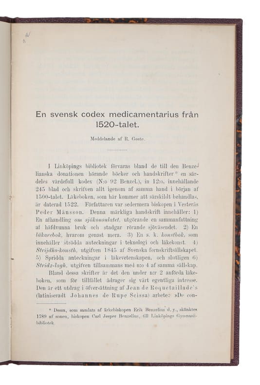 (Stockholm, Central-trykkeriet, 1886). 8vo. In later half cloth with leather title-label to spine. Offpring from ""Farmaceutisk tidskrift"". Nice and clean. 11, (1) pp.