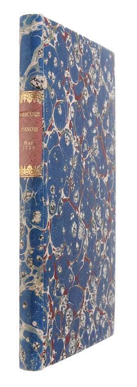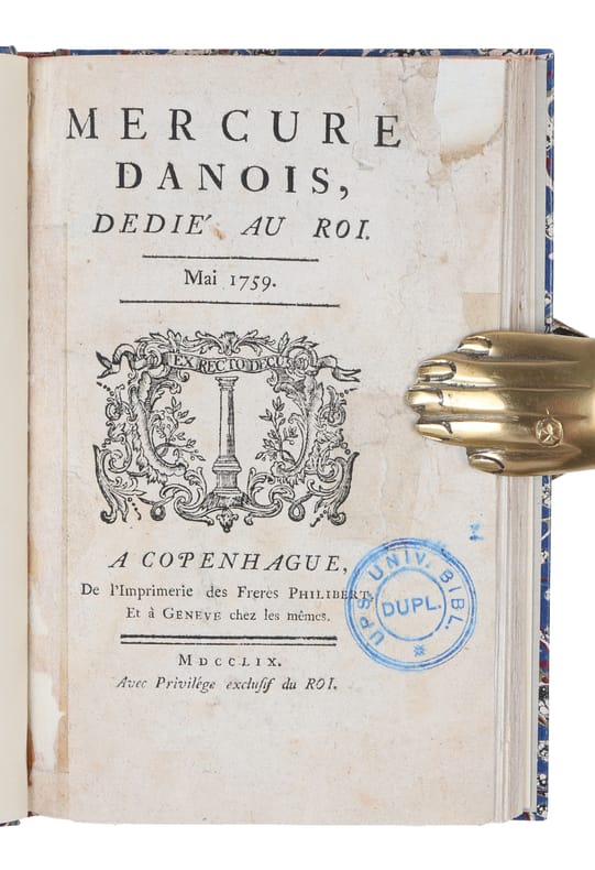 Copenhague, 1759. 8vo. Bound in nice recent marbled paper covered boards with leather title-label to spine. Title-page with stamp and extensive repairs to outer margin, not affecting text. First 7 ff. with repairs in margin, occassionally touching text. Leaf A8 with extensive repairs. 111, (1) pp.