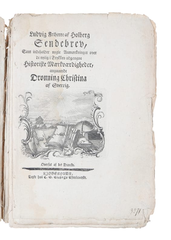 Rare first Danish translation of Holberg’s reply to historian Johann Ackenholtz’s 1751 work, in which Ackenholtz expressed a harsh view of Holberg’s Dannemarks Riges Historie."". Biblioteca Danica II, 491.Ehrencron-Müller XII, 492.