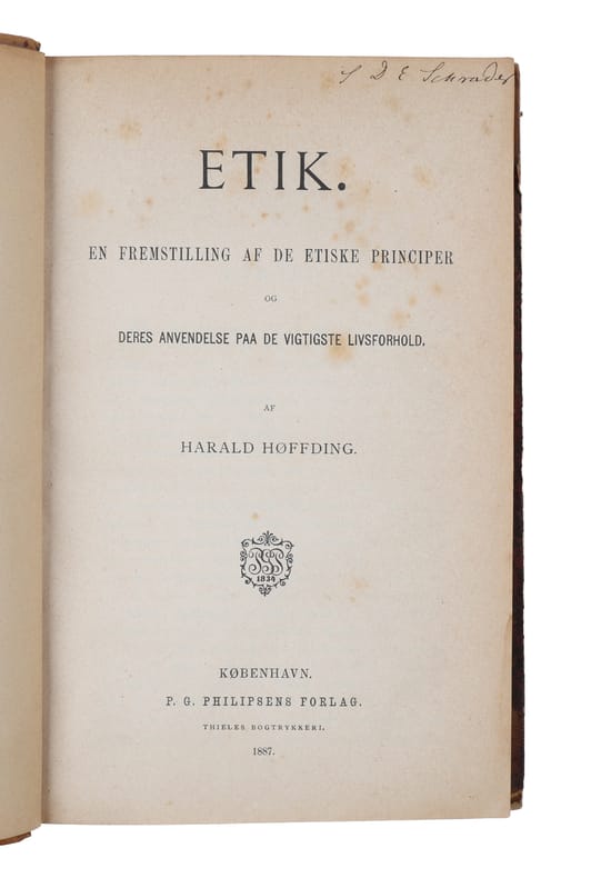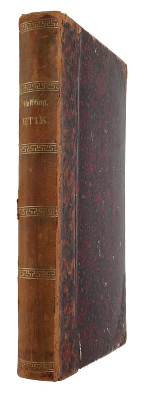 Scarce first edition of the work in which a welfare principle is presented for the first time, laying the groundwork for the welfare state as we know it today. Høffding’s “Ethics” came to have a profound impact upon European politics and philosophical ethics of the Positivist era and directly influenced the development of the Scandinavian welfare state. “[I]t was Høffding who was the first in the world to work out a welfare-principle, namely in his “Etik” (Ethics) in 1887. Today, Høffding is not widely known, but in his lifetime and up to the 1950ties he was an internationally famous philosopher, whose works were translated into many languages and who was several times nominated for the Nobel Prize.” (Andersen, A.T.: The Dialogic and Religious Theme of Welfare in Harald Høffding…, p. 104). “Etik” constitutes an ethical system. Høffding discusses the principal questions in order to develop a scientific ethics, or a moral science if one will, analyzes the ethical principles that are expressed in ethical assessments, and on the basis hereof develops an individualistic and a social ethic that was way ahead of its time, but which found great resonance within the reading public. The book had an enormous impact. It appeared five times in Høffding’s life-time, sold extremely well, and was quickly translated into German and French – “Denmark had gotten its first internationally known and acknowledged philosopher, several decades before Kierkegaard had his breakthrough on the international scene.” (Koch, Dansk filosofi i positivisments tidsalder, p. 41 – translated from Danish). “Høffding became a mentor to many – not least because of the humanity that marks this book [i.e. Ethics] and because of the well-balanced treatment it gives of the social and political questions of the time, of the relationship between the sexes and between church and state, just to mention a few of the “important life conditions” it deals with. Students in personal crisis contacted him, and people in difficult circumstances wrote to him for advice. Not least because of his ethical view, he came to appear as the old, wise man of the nation… His influence in the neighboring countries was also great. For instance, his ethical considerations in the years around 1900 came to play a significant role for the young Swedish social democrats and for their conception of a coming welfare state.” (Koch, Dansk filosofi i positivisments tidsalder, p. 60 – translated from Danish). “Harald Høffding, the Danish philosopher and historian of philosophy, was born in Copenhagen and lived there throughout his life. From 1883 to 1915 he was professor of philosophy at the University of Copenhagen. Høffding received a degree in divinity in 1865, but he had already decided not to take orders. A study of Søren Kierkegaard's works, and especially of his views on Christianity, had led to an intense religious crisis ending in a radical break with Christianity. Høffding sought in philosophy a new personal orientation and gradually developed into an extraordinarily many-sided liberal humanist. His philosophical development was influenced during a stay in Paris (1868–1869) by the study of French and English positivism… his activity as a scholar ranged over every branch of philosophy, including psychology. His works display a vast knowledge, a keen eye for essentials, and a critically balanced judgment. They were translated into many languages and widely used as textbooks. By the turn of the twentieth century Høffding's reputation was worldwide and he knew personally many leading thinkers. He was the outstanding Danish philosopher of his day, and in 1914 the Royal Danish Academy of Sciences and Letters assigned him the honorary residence of Gammel Carlsberg, where he lived to the end of his life. The residence later passed to the physicist Niels Bohr, a younger friend of Høffding.” (Frithiof Brandt, Encyclopaedia of Philosophy). “The Danish philosopher Harald Høffding was the first in the world to work out a welfare-principle. He expressed a dialogic and democratic standpoint, a fellowship and an ideal concerning equality, and consequently a distinct philosophical basis for the realization of the formation of the welfare state.” (Andersen, A.T.: The Dialogic and Religious Theme of Welfare in Harald Høffding…, p. (103).).