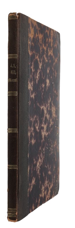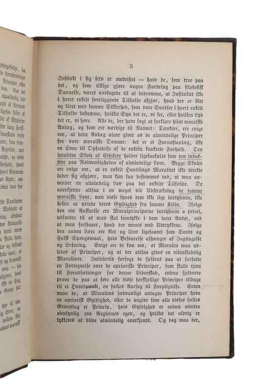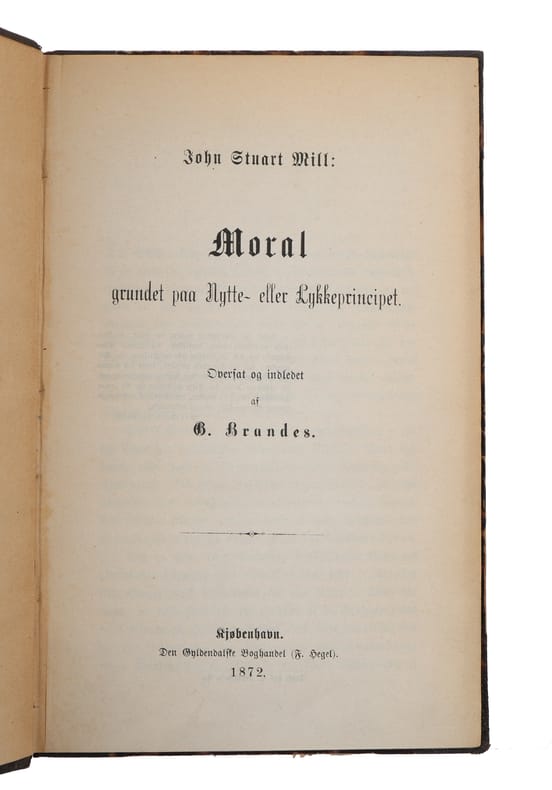 Scarce first edition of the first Danish translation of Mill’s seminal “Utilitarianism”, translated by the great Georg Brandes and with the most excellent provenance, namely that of the founder of the welfare principle, which laid the groundwork for the welfare state as we know it today, Harald Høffding, with his numerous handwritten notes, annotations, and markings, and later given to someone by Høffding’s pupil, the important Danish philosopher Frithiof Brandt. Mill’s “Utilitarianism” constitutes a classic within the field of moral and political thought and is considered ""the most influential philosophical articulation of a liberal humanistic morality that was produced in the nineteenth century."" (Encycl. Of Philosophy). Originally published as a series of three separate articles in 1861, it was collected and printed as a single work under the canonical title in 1863. This publication is now considered the classic exposition and defense of Utilitarianism in ethics, a revolution within moral philosophy. The work was translated into Danish by the immensely influential literary critic Georg Brandes, by many considered the greatest intellectual of his time. Brandes played a key role in introducing especially German and British thought to Scandinavia, most notably the works by such thinkers as Darwin and Nietzsche. He is also the first to translate Mill’s works and make them accessible to a Scandinavian readership. His translation of “Utilitarianism” appeared in 1872 and was responsible for spreading the utilitarian philosophy to a wider audience in the North, indirectly - through Høffding - contributing to the formation of the welfare state that the Scandinavian countries are so famous for. It was through the reading of primarily Mill and Bentham that Harald Høffding came to develop his welfare principle, a principle that he is the first in the world to work out, and the principle upon which the modern welfare state is founded. He is primarily inspired by Mill’s Utilitarianism, but comes to largely replace the conceptions of utility and happiness using instead the welfare principle as a specification of the yardstick that must be used to evaluate actions. “The object of the welfare-principle is not the individual or momentary inclination, rather the lasting vital necessities of the human race, and therefore it places the point of judgment at the effects of an action.” (Thyrring Andersen, p. 105). “In the abandonment of the Christian ethics, positivism had to try to give the grounds for a morality which does not seek refuge with a divine authority. The contribution of Harald Høffding lies in a continuation of the utilitarianism in Jeremy Bentham and John Stuart Mills, whose normative theories on ethics claim that the correct ethically is the one that compared to the other options produces the greatest amount of positive values. And that means that the ethical values of an action depend on its ability to increase the amount of happiness. The principle of utility is formulated this way: The greatest possible happiness for the greatest possible number of people. Among the problems in this ethics are how different forms of values can be compared, which yardstick they can be measured by, and how a just and/or fair distribution of boons can be based.” (Thyrring Andersen, p. 104). Høffding had his starting point in Utilitarianism, but he transcended the more narrow principle of happiness. His welfare principle does not identify the supreme good with the happiness of the individual, “but considers the utmost purpose of being as the appearance of men of sterling characters, who have a feeling of happiness in working for the common good. … a decisive precondition of this was the commandment concerning charity in the Gospels and the historical development of this in Christianity.” (Thyrring Andersen, p. 109). Georg Brandes was the leading intellectual of his time in Denmark and must be credited with bringing European thought to Scandinavia, not only through his incredibly popular and famous lectures, but also through his own writings and not least through his translations of the most important works of the period into Danish. In Denmark, Brandes was synonymous with “the modern breakthrough” and therefore, for most, also the symbol of democracy and what we today would call welfare-thinking. At a closer look, however, Brandes was also in many ways an anti-democrat and so influenced by the thoughts of Darwin and especially Nietzsche that his views came to be very much opposed to those of a society based on a welfare principle that Høffding came to develop. “[I]t was Høffding who was the first in the world to work out a welfare-principle, namely in his “Etik” (Ethics) in 1887. Today, Høffding is not widely known, but in his lifetime and up to the 1950ties he was an internationally famous philosopher, whose works were translated into many languages and who was several times nominated for the Nobel Prize.” (Andersen, A.T.: The Dialogic and Religious Theme of Welfare in Harald Høffding…, p. 104). His great work ""Etik"", in which he developed the welfare-principle, constitutes an ethical system. Here, Høffding discusses the principal questions in order to develop a scientific ethics, or a moral science if one will, analyzes the ethical principles that are expressed in ethical assessments, and on the basis hereof develops an individualistic and a social ethic that was way ahead of its time, but which found great resonance within the reading public. The book had an enormous impact. It appeared five times in Høffding’s life-time, sold extremely well, and was quickly translated into German and French – “Denmark had gotten its first internationally known and acknowledged philosopher, several decades before Kierkegaard had his breakthrough on the international scene.” (Koch, Dansk filosofi i positivisments tidsalder, p. 41 – translated from 
