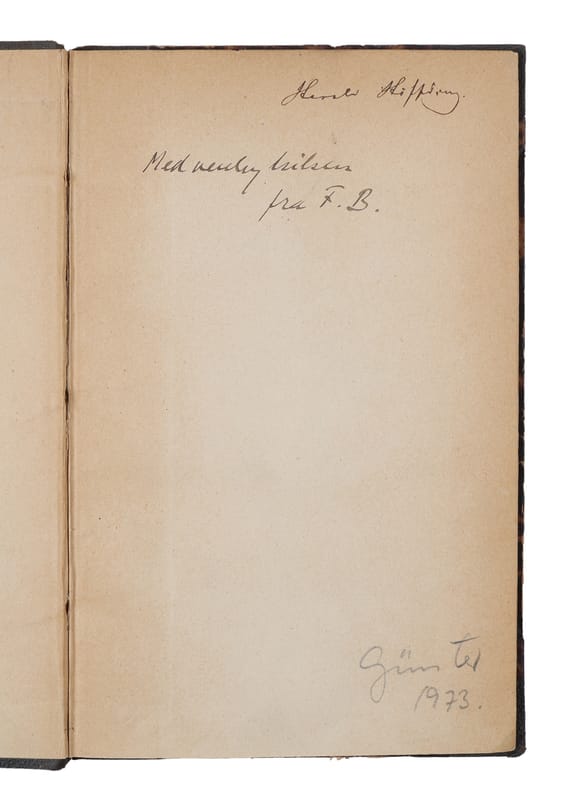 Kjøbenhavn (Copenhagen), Gyldendal, 1872. 8vo. Contemporary brown half cloth with gilt lettering to spine. Capitals worn and wear along edges. Internally a bit of light scattered brownspotting, but overall very nice. With numerous pencil-underlinings as well as pencil-markings, and -annotations, the latter in Høffding's hand (the underlinings possibly in Brandt's). With the ownership signature of Harald Høffding to front free end-paper and with a later presentation-inscription from Frithiof Brandt (signed F. B.) underneath. Recent ownership signature in pencil to foot of front free end-paper (1973). (2), VIII, 85, (1) pp.