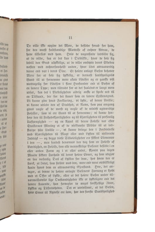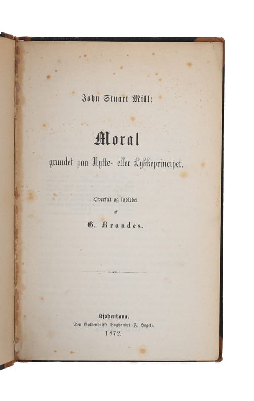 Scarce first edition of the first Danish translation of Mill’s seminal “Utilitarianism”, translated by the great Georg Brandes. Mill’s “Utilitarianism” constitutes a classic within the field of moral and political thought and is considered ""the most influential philosophical articulation of a liberal humanistic morality that was produced in the nineteenth century."" (Encycl. Of Philosophy). Originally published as a series of three separate articles in 1861, it was collected and printed as a single work under the canonical title in 1863. This publication is now considered the classic exposition and defense of Utilitarianism in ethics, a revolution within moral philosophy. The work was translated into Danish by the immensely influential literary critic Georg Brandes, by many considered the greatest intellectual of his time. Brandes played a key role in introducing especially German and British thought to Scandinavia, most notably the works by such thinkers as Darwin and Nietzsche. He is also the first to translate Mill’s works and make them accessible to a Scandinavian readership. His translation of “Utilitarianism” appeared in 1872 and was responsible for spreading the utilitarian philosophy to a wider audience in the North. The idea of Utilitarianism became immensely influential in Scandinavia. It inspired, for instance, Haralds Høffdig (1843-1931) to formulate the welfare principle, contributing to the formation of the welfare state that the Scandinavian countries are so famous for.