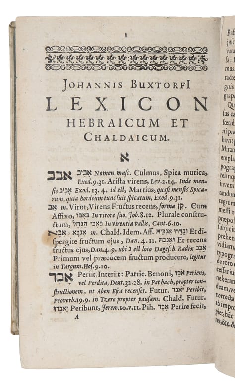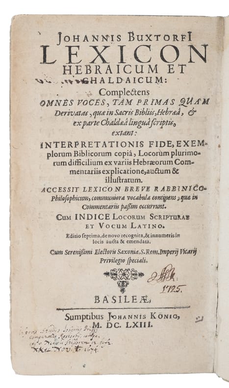 Sixth edition of Buxtorf highly influential Hebrew lexicon printed in numerous edition. Johann Buxtorf (1564-1629), the ""Master of the Rabbis,"" despite being a Protestant, was a Hebrew professor at the University of Basel for thirty-nine years. Upon his death, his position passed to his son Johann, known as Buxtorf the Younger (1599-1664), and then to his grandson, Johann Jakob (1645-1704). Throughout his life, he worked on the Masoretic text of the Old Testament, largely established by the Tiberian School in the 9th century. This text defined the authoritative biblical canon within Judaism and served as a reference for most Protestant and Catholic translations of the Old Testament.