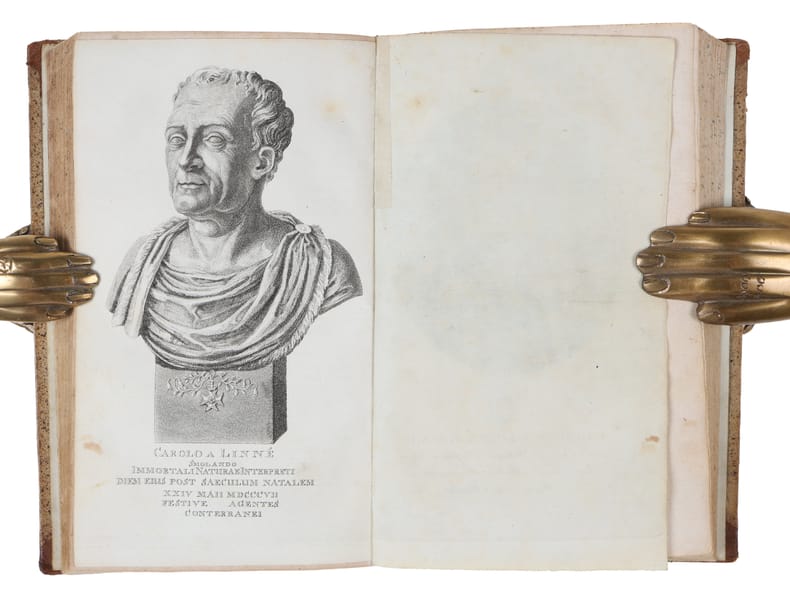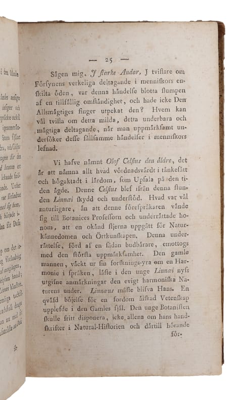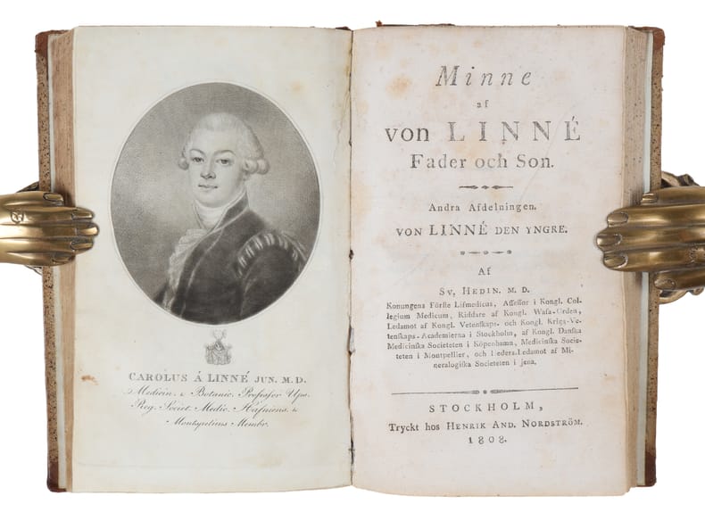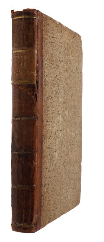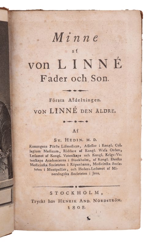 First edition. The volume is divided into two sections entitled “von Linné den äldre” and “von Linné den yngre.” The first contains the panegyric on Linnaeus delivered at the Växjö gymnasium on the occasion of the Linnaean centenary. The second opens with a memoir of Linnaeus the Younger, followed by “Historiska upplysningar till Carl von Linné den äldres lefverne” Soulsby 2647.