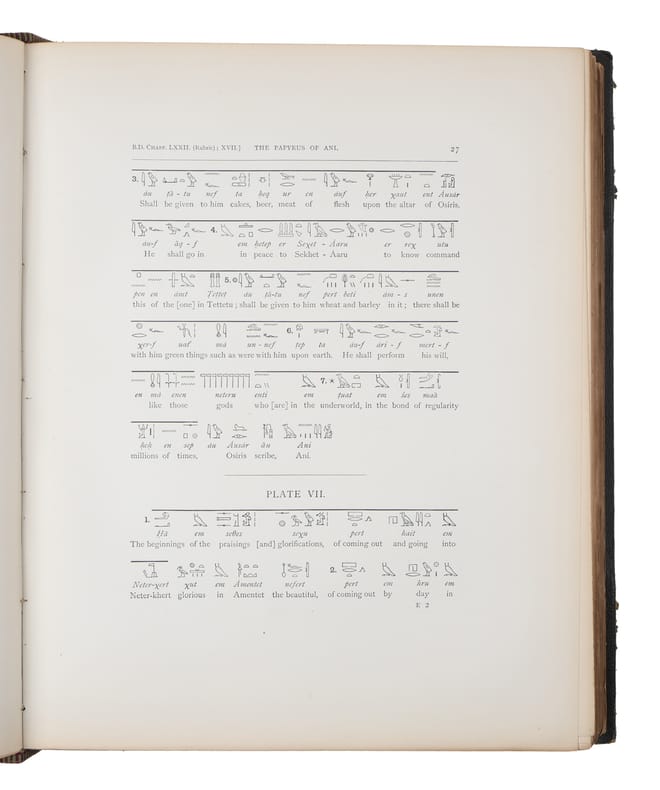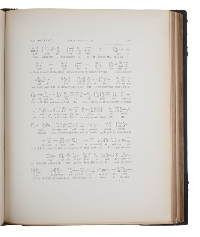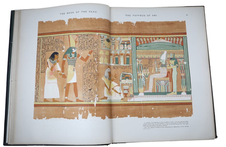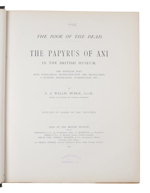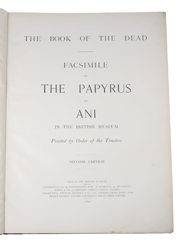 Second edition of the plate volume together with the first edition of the text (as it is supposed to be), being the first collected edition of the magnificent British Museum's facsimile of the Papyrus of Ani. The first edition of the plate-volume appeared alone, without the text, in 1890, and in 1894, a second edition of the plate-volume was issued to accompany the first edition of the text. Thus, a uniform set of the entire work originally belonging together will be made up of a second edition of the plate-volume together with the first edition of the text-volume. Produced around 1250 BCE, the lavishly illustrated papyrus of Ani remains one of the most splendid examples of the Book of the Dead. Egyptians compiled an individualized book for certain people upon their death, called the Book of Going Forth by Day, more commonly Book of the Dead, typically containing declarations and spells to help the deceased in the afterlife. The Papyrus of Ani, which is now in the British Museum, is the manuscript compiled for the Theban scribe. ""The scroll was discovered in Luxor in 1888 by Egyptians trading in illegal antiquities. It was acquired by E.A. Wallis Budge... Shortly after Budge first saw the papyrus, Egyptian police arrested several antiquities dealers and sealed up their houses, one of which contained the objects Budge had purchased from the dealers. Budge distracted the guards by offering them a meal while locals tunnelled under the house's walls to retrieve the objects, including the Papyrus of Ani. Stored in several custom tin boxes, the papyrus and other objects Budge had acquired were then smuggled to the principal librarian at the British Museum. Budge was afterward paid a 150GBP ""gratuity"" from the British Treasury on behalf of the British Museum for acquiring the papyrus.""