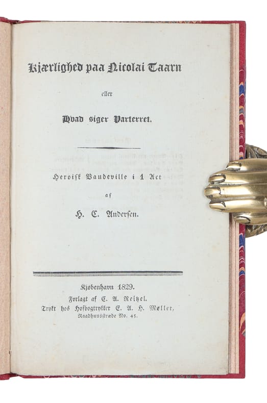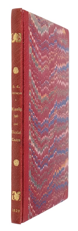 Kjøbenhavn, Reitzel, 1829. First edition of Hans Cristian Andersen's third publication in book form and his first dramatic work. This seminal publication marked his stage-debut and was not only the first work that he wrote for the theatre, but also the first of his works that was performed on the stage. It is with the present work, ""Love in Nicolai Tower"" that Hans Christian Andersen inaugurated his dramatical production, a genre that came to define much of his literary production for the next forty years, over the cause of which he produced about as many plays - i.e. ab. 40. The question as to acceptance from the theatre and the the set-up of the plays, however, -especially at the beginning of his career - would often postpone the actual theatre debut by many months, sometimes years. Thus, many of his early plays were only performed on the stage much later. ""Kjærlighed on Nicolai Taarn"", however, was accepted almost immediately and was performed already the following year, marking his theatre debut.