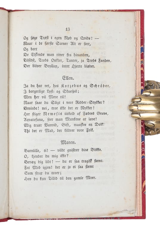 First edition of Hans Cristian Andersen's third publication in book form and his first dramatic work. This seminal publication marked his stage-debut and was not only the first work that he wrote for the theatre, but also the first of his works that was performed on the stage. It is with the present work, ""Love in Nicolai Tower"" that Hans Christian Andersen inaugurated his dramatical production, a genre that came to define much of his literary production for the next forty years, over the cause of which he produced about as many plays - i.e. ab. 40. The question as to acceptance from the theatre and the the set-up of the plays, however, -especially at the beginning of his career - would often postpone the actual theatre debut by many months, sometimes years. Thus, many of his early plays were only performed on the stage much later. ""Kjærlighed on Nicolai Taarn"", however, was accepted almost immediately and was performed already the following year, marking his theatre debut.