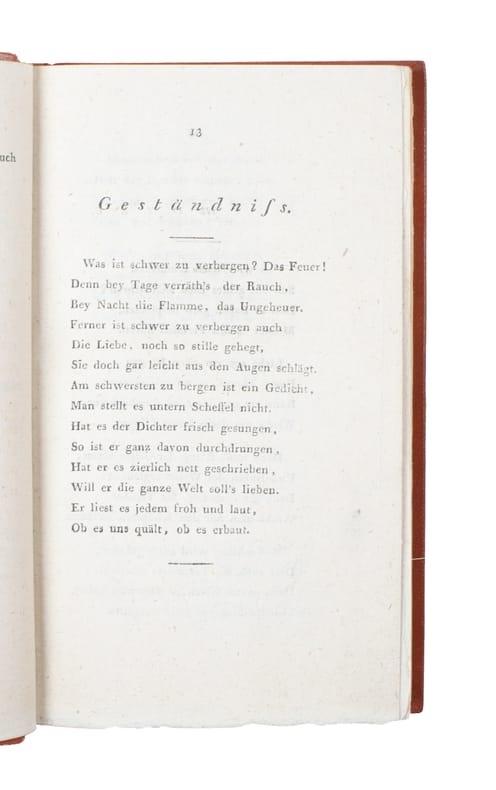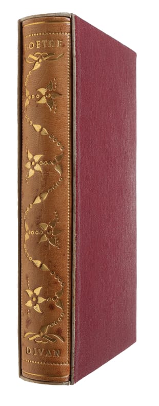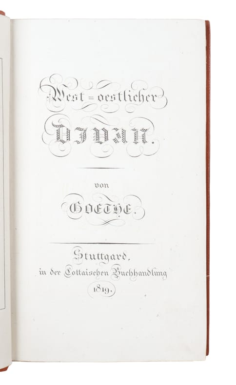 A very fine copy of the first edition, first issue, of Goethe’s celebrated cycle of lyrical poems, inspired by the works of the great Persian poet Hafez. Intended as a poetic dialogue between East and West, “Divan” also reflects Goethe’s deep affection for the Austrian dancer Marianne von Willemer (1784–1860) who contributed several poems to the collection. Furthermore it represents one of the most important engagements with Eastern poetry in German Romantic literature and contains some of the finest verses of Goethe’s later years. “The West-Eastern Divan is in many ways a revolutionary book. Goethe himself was no revolutionary – far from it – and yet his book had the effect of capsizing conventional nineteenth-century conceptions of poetry. It represented nothing less than a decisive reconfiguration of poetry.” (…) By 1814, five years before the publication of the Divan, Goethe had come upon the poems of Hafiz in the translation of Joseph von Hammer (later von Hammer-Purgstall), a prolific Orientalist who had rendered the complete Divan of the Persian poet into German. The word divan (diwan in Arabic) is itself of Persian origin originally it meant a kind of register, a record. (The word has passed into European languages to designate border and customs controls, e.g., douane in French or dogana in Italian.) An early Arab philologist could state that ‘poetry is the diwan of the Arabs’. By that he meant that the poems of the pre-Islamic Arabs, with their very specific mentions of places and of tribes, of battles and skirmishes, of blood-feuds and clan rivalries, served as a record of events that would otherwise have been lost. (…) But the word divan also came to designate the collected works of a poet. And it is in conscious imitation of his beloved ?afi? that Goethe chose to use the word Divan for his own collection. Even so, there is a crucial distinction to be noted. Goethe calls his own collection the West-östlicher Divan, the West-Eastern Divan. His Divan is not to be simply an imitation of an Eastern model but a work that holds both East and West in firm but affectionate equipoise.” (From the introduction of Ormsby’s English translation to West-Eastern Divan).Hagen 416