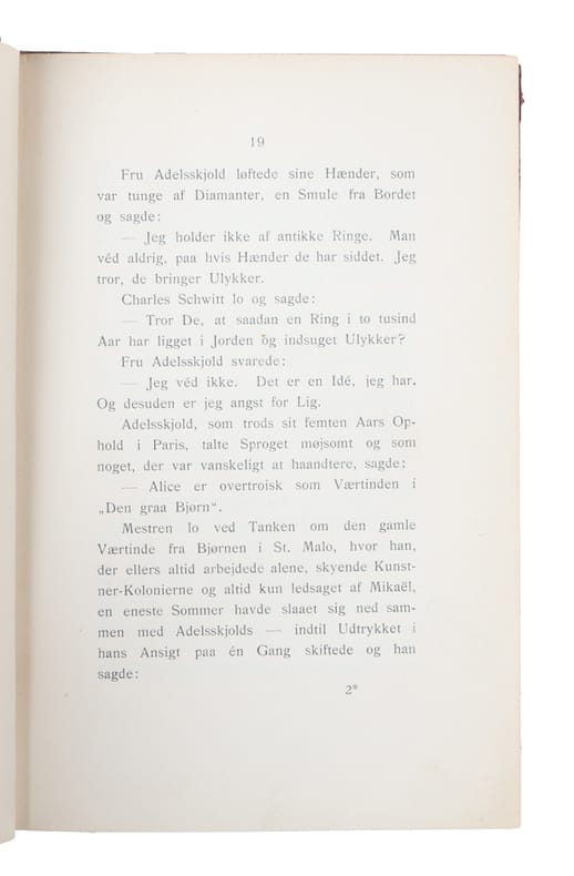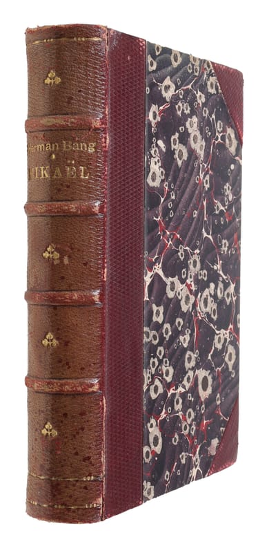 København & Kristiania, Gyldendal, 1904. 8vo. Indbundet i et samtidigt halvlæderbind med forgyldt rygtitel. Ryg falmet og med kantslid. Med egenhændig, uadresseret dedikation fra Bang, skrevet på tværs af smudstitelbladet: ""Nu kan jeg dø roligt, for jeg har sét en stor Kærlighed. / 30.9.1905 Herman Bang."" Ren og pæn indvendig.