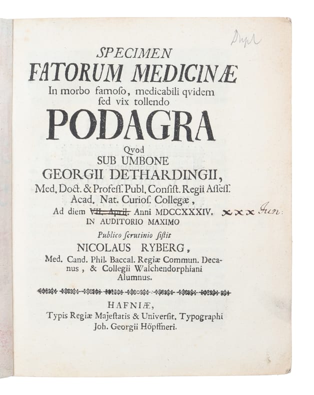 Rare first edition of Nicolaus Ryberg’s dissertation on gout.