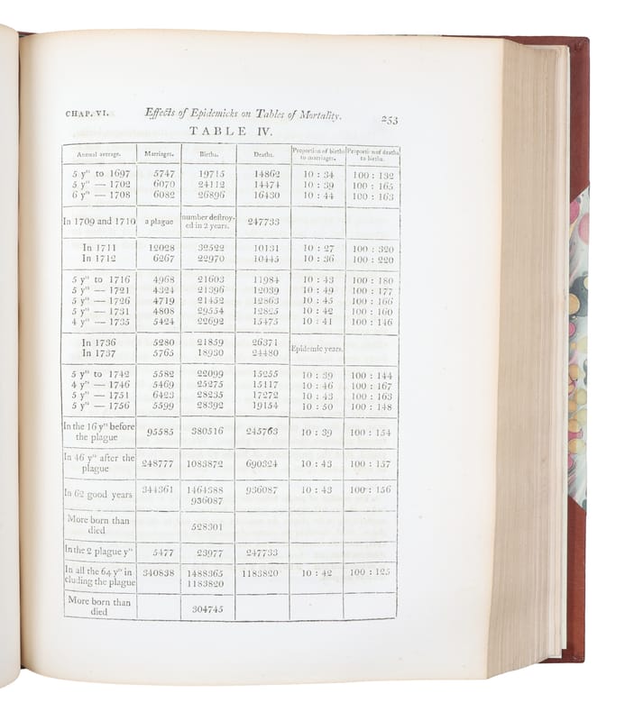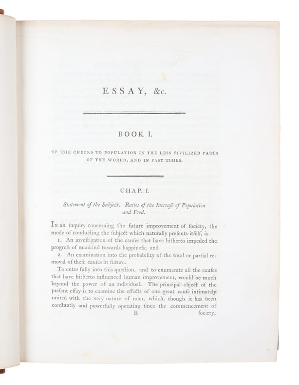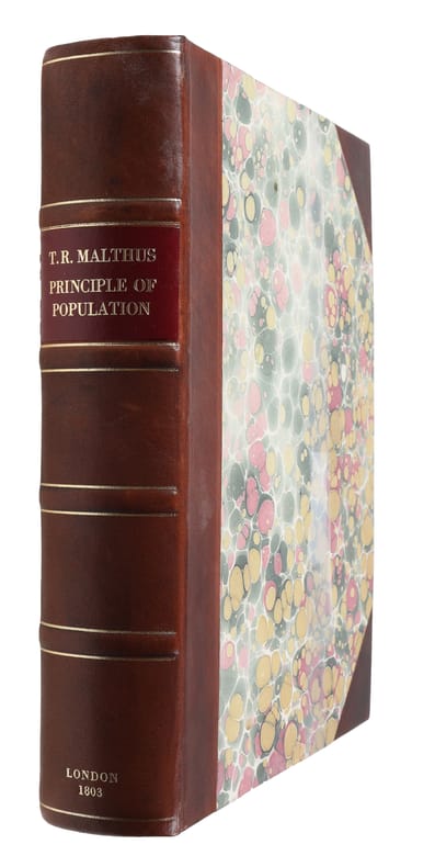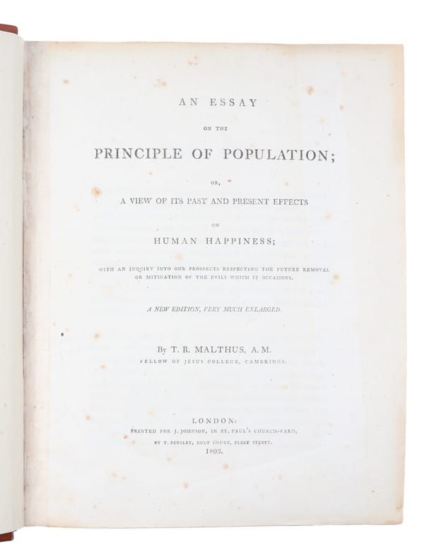 The Great Quarto-edition of Malthus' milestone work, the first and most influential book on population. Although being the second edition, after the anonymously printed first of 1798, it is so significantly altered, revised, and expanded that it is considered a new work rather than a new edition. Malthus himself also thought of it as such. It is nearly four times the length of the 1798 essay, the title has been changed (the title of the first: ""An Essay on the Principle of Population, as it Affects the Future Improvement of Society with Remarks on the Speculation of Mr. Godwin, M. Condorcet, and Other Writers""), and it is published with Mathus' name as the author, not anonymously. All later editions were minor revisions of this heavily expanded and altered second one. ""In the course of this inquiry, I found that much more had been done, than I had been aware of, when I first published the essay. The poverty and misery arising from a too rapid increase of population, had been distinctly seen, and the most violent remedies proposed, so long ago as the times of Plato and Aristotle. And of late years, the subject had been treated in such a manner, by some of the French economists, occasionally by Montesquieu, and, among our own writers, by Dr. Franklin, Sir James Steuart, Mr. Arthur Young, and Mr. Townsend, as to create a natural surprise, that it had not excited more of the publick attention"" (Preface to the second edition, p. IV). The controversial views, because of which the work became so influential, are most provocative and eyeopening in the second edition, in which Malthus for instance for the first time advocates moral restraint (meaning sexual abstinence and late marriage) and elaborately explains his comparison between the increase of population and food. ""The ""Essay"" was highly influential in the progress of thought in the early nineteenth-century Europe.... ""Parson"" Malthus, as Cobbett dubbed him, was for many, a monster and his views were often grossly misinterpreted... But his influence on social policy, whether for good or evil, was considerable. The Malthusian theory of population came at the right time to harden the existing feeling against the Poor Laws and Malthus was a leading spirit behind the Poor Law Amendment Act of 1834."" (PMM 251). Thomas Robert Malthus (1766-1834), called the ""enfant terrible"" of the economists, was an English demographer, statistician and political economist, who is best known for his groundbreaking views on population growth, presented in his ""Essays on the Principle of Population"", which is based on his own prediction that population would outrun food supply, causing poverty and starvation. Among other things this caused the legislation, which lowered the population of the poor in England. Malthus actually turned political, economic, and social thought upside down with this work, which has caused him to be considered one of the 100 most influential persons in history (Hart, The 100: A Ranking of the most Influential Persons in History, 1978). Malthus was, naturally, condemned by Marx and Engels, and opposed by the socialists universally, but the work had an enormous impact on not only politics, economics, and social sciences, but also on natural sciences. For instance, both Darwin and Wallace considered Malthus a main source in their development of the theory of natural selection, considering him a great philosopher and his Essay on Population one of the most important books ever. ""Malthus’s idea of man’s ""Struggle for existence"" had decisive influence on Charles Darwin and the theory of evolution. Other scientists related this idea to plants and animals which helped to define a piece of the evolutionary puzzle. This struggle for existence of all creatures is the catalyst by which natural selection produces the ""survival of the fittest""... Thanks to Malthus, Darwin recognised the significance of intraspecies competition between populations of the same species (e.g. the lamb and the lamb), not just interspecies competition between species (e.g. the lion and the lamb). Malthusian population thinking also explained how an incipient species could become a full-blown species in a very short timeframe."" The second edition must be considered the most important of all the editions. This is far more a work on the problems of over-population than it is a response to Godwin and Condorcet on their works (whic is the main concern of the first edition). ""Not so much shocked by his own conclusions, in his ""Essay on Population"" (first ed. 1798), as driven by a naturally inquiring mind, he travelled for three years through Europe gleaning statistics and then published a second edition (1803)."" (Catlin, A History of the Political Philosophers, 1939, p. 377). PMM 251 (first edition).