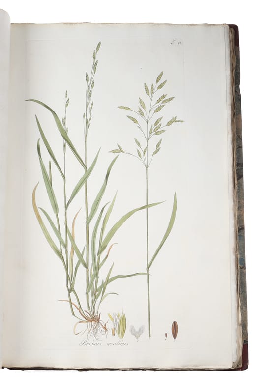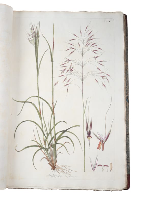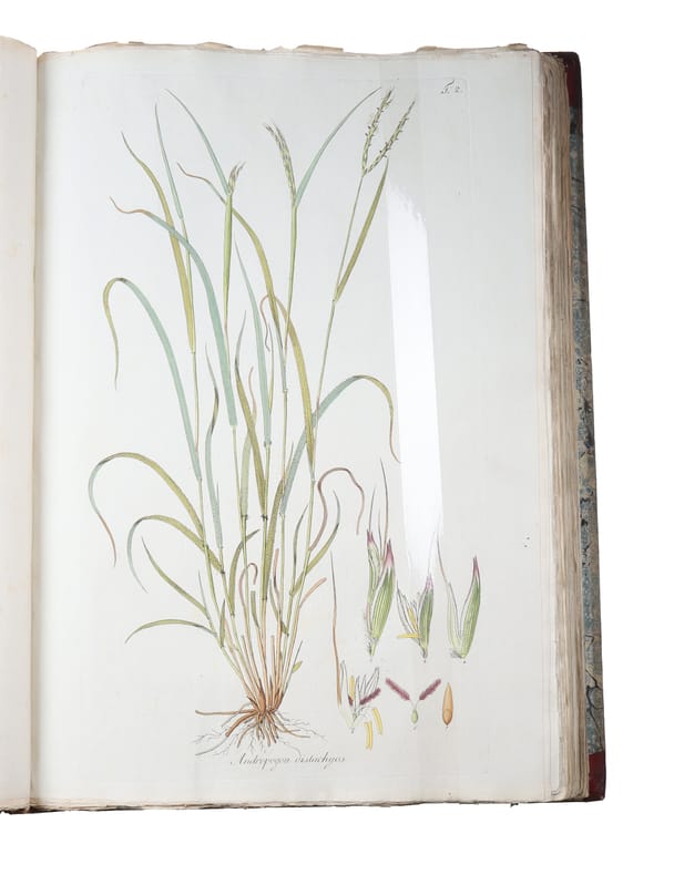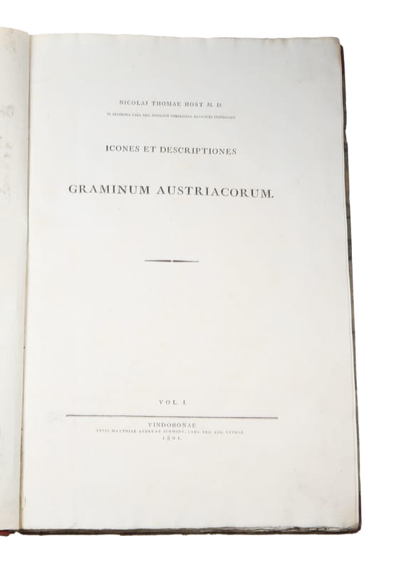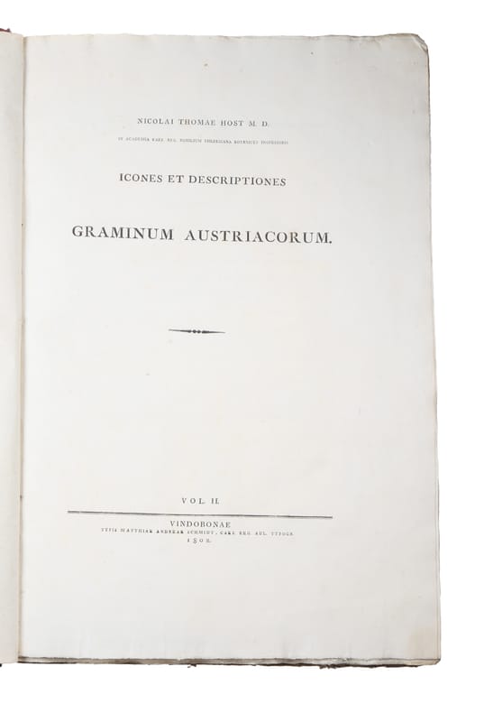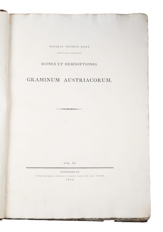 A wonderful, tall, large, uncut copy printed on good paper of this magnificent work on grasses by the first director of the botanical garden in Vienna. A fourth volume, also comprising 100 plates, was issued 4 years later in 1809 - it is not present here. The beautiful plates are unsigned but drawn by Johannes Baptista Jebmayer (J. Ibmayer). The work is one of the finest works on grass ever produced, even while in production, it was praised for the ""elegance and correctness"" of the plates - ""Both adjectioves are justified"" the botanical details, in particular, are beautifully done, and often - to those of us who think of grass as being simply green - surprisingly colourful."" (Coats)""The work is a product of the golden Age of Viennese botany, when Hapsburg patronage attracted many botanists, and paid for lavish publication of their work. The present work is dedicated to the Emperor Francis I and his subsidy was particularly necessary as grasses are a 'difficult' group with restricted appeal"" no other work on the family can approach this one in magnificence."" Nikolaus Host was personal physician to Franz I and director of the botanical garden in Vienna, which was founded by the emperor on the advice of Host. Host ""established a botanic garden for the cultivation of Autrian plants, in the grounds of the Belvedere in Vienna, and travelled all over the country to collect them"" but his great ""Flora Austriaca"" was still unfinished when he died at the age of seventy-three."" (Coats). Blunt, Great Flower Books p. 103Nissen No. 935Pritzel No. 4285Coats no. 92