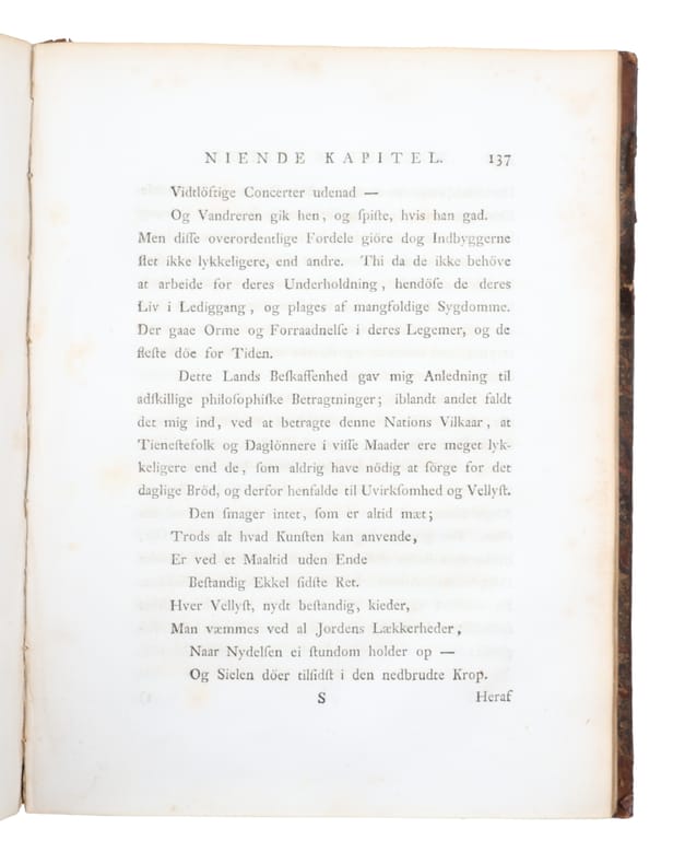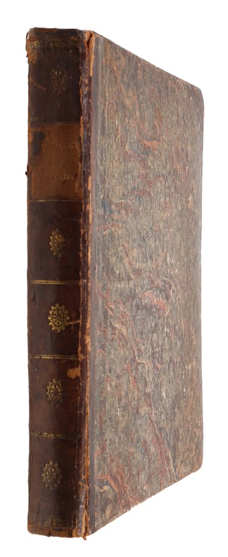 Kbh., 1789. 4to. Samt. slidt hldrbd. m. rig rygforgyldn. False slidte og delvist revnede. Kapitæler professionelt restaurerede. Titelbl. lidt nusset, indimellem en smule brunplettet. P. 228 ubeskåret og foldet, bevarende samt. marginale noter, bestående af en engelsk oversættelse, p. 276 ligeledes m. marginale noter på engelsk i samme hånd, den ubeskårne side m. understregninger i teksten. På skrivepapir. M. alle 16 kobberst. plancher af Clemens, de 15 efter Abildgaard og Niels Klim som drabant efter Juel.