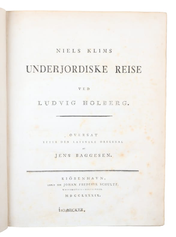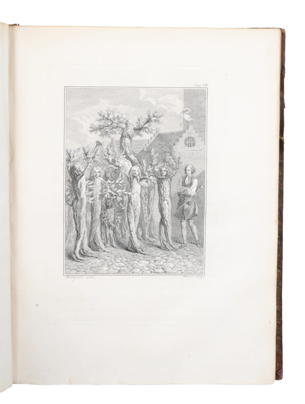 Kiöbenhavn, Johan Frederik Schultz, 1789. 4to. Samtidigt marmoreret helldrbd. m. ophøjede bd. på ryg og rig rygforgyldn. På skrivepapir men med en del sprete brunpletter, mest marginale. 16 kobberstukne plancher af Clemens, de 15 efter Abildgaard og Niels Klim som drabant efter Juel.