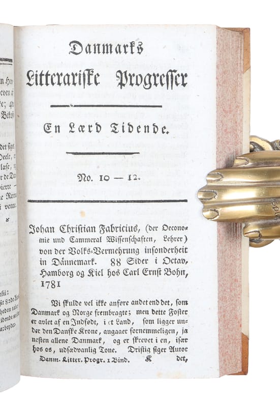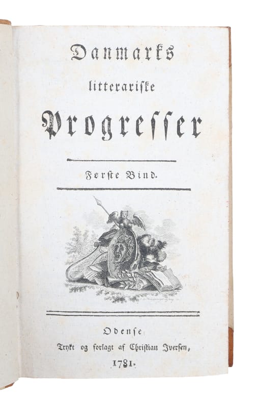 First volume in ""Danmarks litterariske progresser"" (“Denmark’s Literary Progresses”), Danish periodical published from 1781 to 1789 edited by F. Dræbye. The journal later changed its name to ""Historisk, politisk, satyrisk, poetisk, moralsk"" (“Historical, Political, Satirical, Poetic, Moral”) and was issued in a total of four volumes during that period. Biblioteca Danica IV, 537.