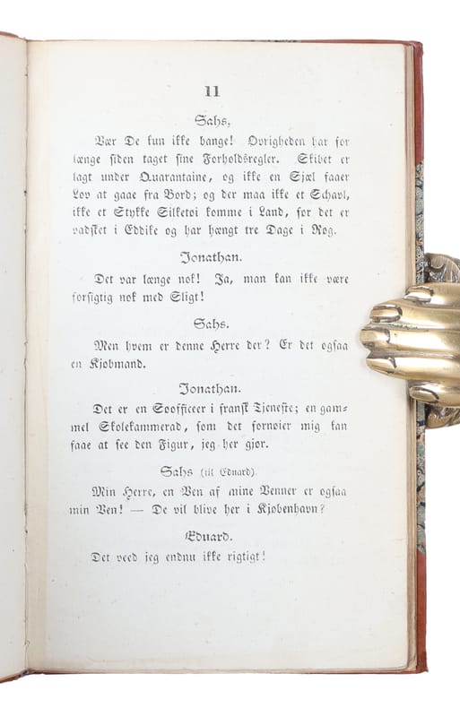Exceedingly scarce first edition of Andersen's second theatre-performed piece. The work is extremely rare and almost never turns up in the trade. Apart from his debut book, ""Ungdoms-Forsøg""/""Palnatokes Grav"", this is presumably the scarcest Andersen-title. Hans Christian Andersen inaugurated his dramatical production with ""Kjærlighed paa Nicolai Taarn"" in 1829, a genre that came to mean a lot to him, and for which he continued producing plays for forty years, amounting to about as many plays. The question as to acceptance from the theatre and the the set-up of the plays, however, -especially at the beginning of his career - would often postpone the actual theatre debut by many months, sometimes years. And thus, although Andersen had translated/ re-written two other plays for the stage, before he re-wrote ""Skibet"" (""The Ship""), after Scribe and Mazere's ""La Quarantaine"", ""Skibet"" came to be the very first re-worked play by Andersen that was performed at the theatre and only the second play at all, following his own ""Kjærlighed paa Nicolai Taarn"". Together with ""Kjærlighed paa Nicolai Taarn"", ""Skibet"" constitutes his dramatical/theatre-debut and was of immense importance to him. After ""Skibet"", he continued to re-write foreign pieces for the stage and gained more and more success in this endeavour. BFN 166.