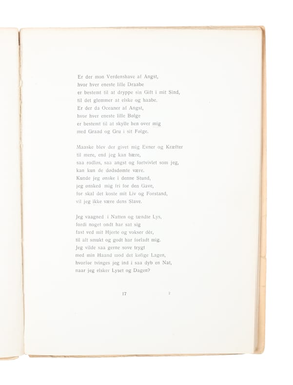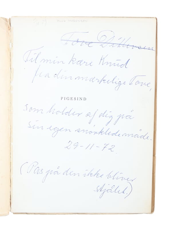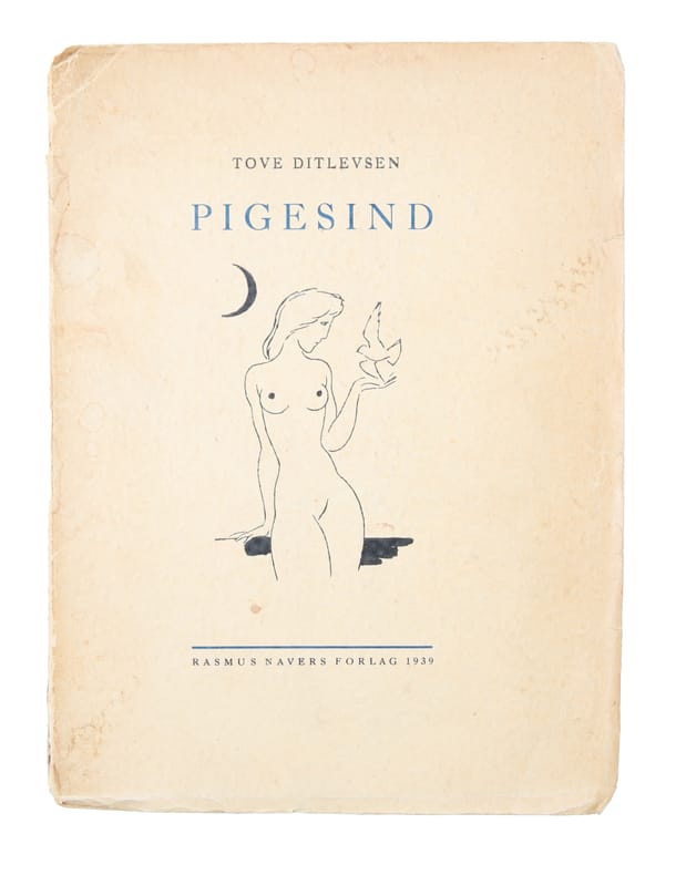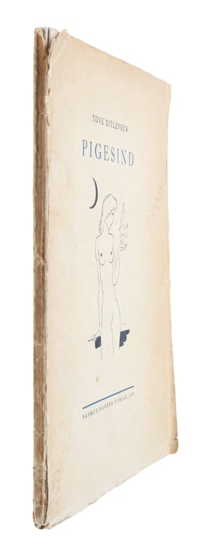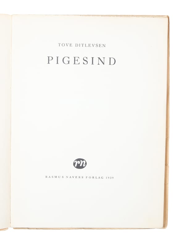 The rare first edition, here inscribed by Ditlevsen more than thirty years later to her last companion, Knud Mogensen, of Ditlevsen’s seminal debut publication. Allegedly, she only gave away ten presentation copies of her debut publication, making them of the utmost scarcity. The personal and slightly ironic tone of the inscription reflects the complex relationship between Ditlevsen and Mogensen whom she met through a personal ad after her divorce from Victor Andreasen. In a letter to her publisher’s Ditlevsen wrote: “Jeg kan jo ikke være alene, og nu er han der nu engang. Sød og hjælpsom er han, men sådan virkelig tale med ham, kan jeg ikke.” (Ditlevesen’s collection of letters “Kærlig Hilsen, Tove”, p. 87). (i.e. English: “I cannot be alone and now he is here. He is sweet and helpful, but truly converse with him I cannot.”). The two lived together during the final years of her life, a period marked by both tenderness and turmoil, and which found literary expression in her Letters to Knud Mogensen (10 breve til Knud Mogensen, posthumously published 1978). Ditlevsen’s not so loving “Jeg kan jo ikke være alene, og nu er han der nu engang. Sød og hjælpsom er han, men sådan virkelig tale med ham, kan jeg ikke.” (“I cannot be alone and now he is here. He is sweet and helpful, but truly to converse with him I cannot.”) (Ditlevesen’s collection of letter “Kærlig Hilsen, Tove”, p. 87) “Pigesind” consists in 32 poems that range widely from the broodingly sad, over deeply unhappy to the almost cheerful. They represent the mind of a young girl and what goes on in it, a young girl whose life was to be marked by anxiety, drug addiction, and repeated suicide attempts. Ditlevsen is considered one of the most important and unique voices in twentieth-century Danish literature and many of the themes she touches upon ring a universal bell. Her works are particularly valuable as they dramatize the consequences of locking women into marriage, into the roles of wife and mother. Ditlevsen's writing has had a lasting impact upon Danish literature, and her works continue to be read and studied for their candid and emotional exploration of the human condition. Her life and writing remain highly important subject matters for those interested in Scandinavian literature and the confessional literary tradition. In 2021, The New York Times, The New Yorker, and The Guardian elected Tove Ditlevesen's recently translated ""The Copenhagen Trilogy” as book of the year and celebrated Ditlevsen as one of the most important authors in 20th century literature.