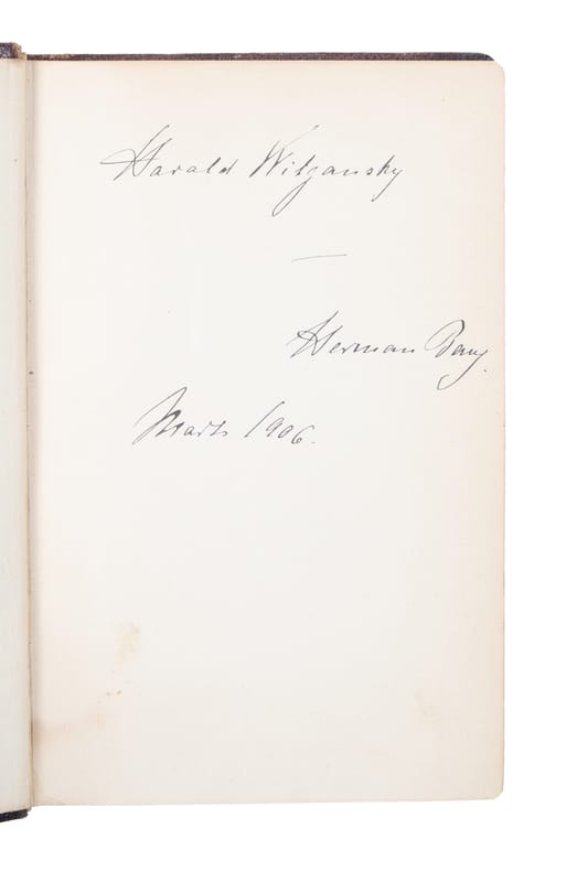 Dedikationseksemplar til Harald Witzansky (1862-1940), ""forretningsfører ved dagbladet Politiken, fra 1902 var han redaktør af avisen København, hvortil Bang fra februar 1902 til December 1911 leverede masser af nyskrevne artikler"" (Posselt, Bibliofiler 21). Herring, p. 510.Posselt, Bibliofiler 21, Paul Sandberg samling af Herman Bang-dedikationer, nr. 66.