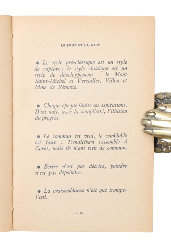 Edition partiellement originale sur papier ordinaire [achevé d'imprimer 4 août 1952]. Recueil de pensées et d'aphorismes illustré de 2 dessins de l'artiste. Papier uniformément jauni.