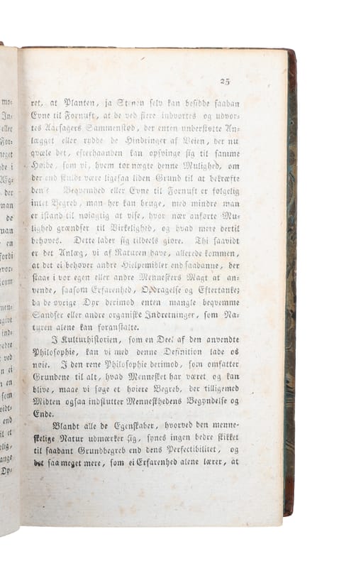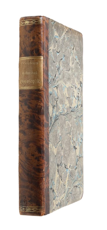 First edition of Treschow’s important history of philosophy, in which he presents his view of the history of humankind. Niels Treschow (1751 - 1833) is generally accepted as the most important Norwegian philosopher before the 20th century. He played a prominent role in the development of hilosophy in Scandinavia in the late 18th and far into the 19th century. He was the first professor of Philosophy at the University of Christiania (today Oslo) (from 1813), and before that he had been professor of Philosophy at the University of Copenhagen (from 1803 till 1813), where he played a very important role, changing the tradition of philosophy in Scandinavia by being one of the first teachers of philosophy, who was also a philosopher himself. His lectures and works were of seminal character, and his way of thinking cleared a path for later important philosophers. He became ""Ridder af Dannebrog"" (an honorary title, -""Knight of Dannebrog"" (Dannbrog being the Danish flag), and he was a member of both the Norwegian and the Danish Academies of Science.Treschow was especially fond of the German rationalists and romantics as well as of English Empiricism, which played a great role in his own philosophy. He was never very influenced by Kant's critical philosophy, and his own philosophy was to a large extemt governed by emotions and intuition, -he was never afraid to think according to his feelings.Apart from being a philosopher, Treschow was also a politician of some influence under the first Norwegian government.Treschow wrote a number of important works, the present being one of the most important ones. All of his works are scarce and sought after, and they rarely appear on the market.