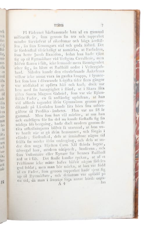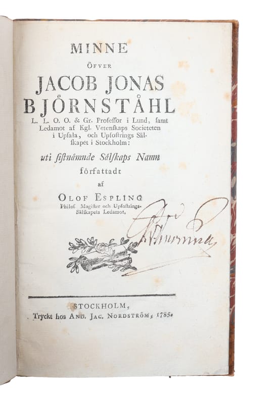 Stockholm, Nordstrom, 1785. 8vo. In a later half calf binding (by the Swedish master bookbinder Gustav Hedberg in Stockholm. Light wear and a few stains to spine. Previous owner's name to title-page. Internally nice and clean, printed on good paper. 53, (1) pp.