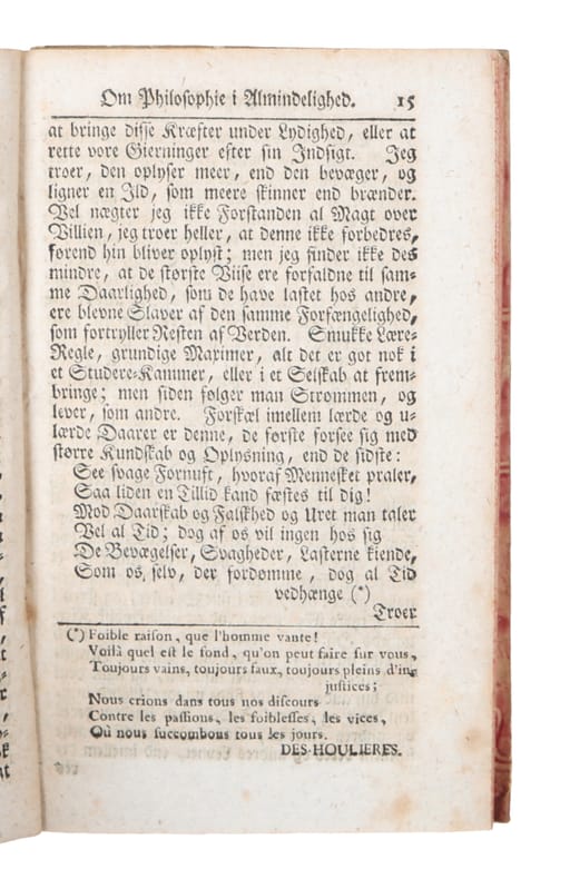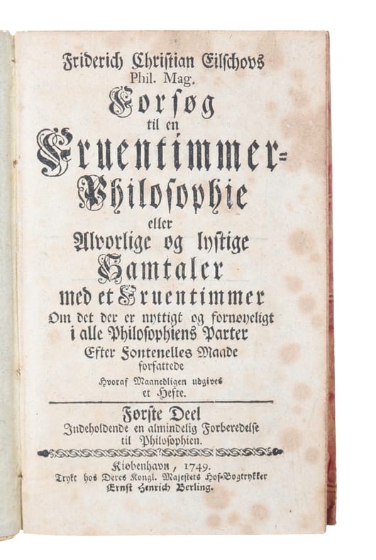 Den sjældne originaludgave, hvori Eilschov introducerede den Wolffske filosofi for kvinder. ""Bogen udkom i tre hæfter. På titelbladet står der ""1. Deel"" men fortsættelsen udkom aldrig, måske fordi han døde af kopper i efteråret 1750. Bogen giver udtryk for væsentlige sider af Fr. Chr Eilschovs (1725-50) tænkning. Han introducerede heri på dansk den Wolffske filosofi for Kvinder. Eilschov følte sig stærkt tiltrykket af den Leibniz-Wilffske rationalistiske filosofi, og på mange punkter gav han den sin tilslutning, man han ønskede dog ikke at blive betragtet som Wolffianer - ""Jeg kand derfore ikke taale at nogen skælder mig Wolffianer. Thi jeg har ikke forpagtet mig bort til nogen."""" (Danske bogsamlere udstiller...2). Udstillet som nr. 41 på Dansk bibliofil-klubs 60 års jubilæumsudstilling.