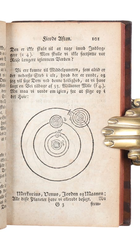 Kiøbenhavn, Trykt hos N. Møller, 1764. 8vo. I samtidigt hellæderbind med forgyldt titel og ornamentik på ryg og blågrønt snit. Lille papirmerkat påklistret ryggen. Udvendig med en smule slitage, ellers pænt eksemplar. (1)-335 pp. (med 14 træsnit af planetbaner, månefaser og andre astrologiske fænomener i teksten).