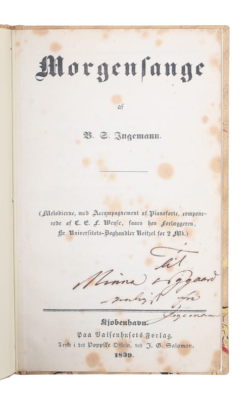Kjøbenhavn, Waisenhusets Forlag, 1839. 8vo. I et nyere papbind med lædertitelfelt på forperm (Anker Kysters Eftf. 1975). Med egenhændig dedikation fra Ingemann: ""Til / Minna Nygaard / venligst fra / Ingemann"". Gennemgående noget brunplettet. 8, 8 pp.