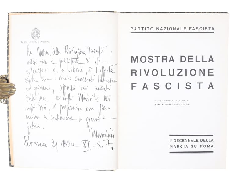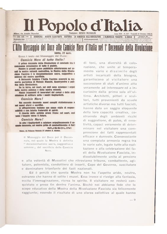 Scarce first edition of this magnifiscent work of fascist propaganda, commemorating the tenth anniversary of the fascist revolution. With a wealth of illustrations reproduced from photographs executed by the Istituto Nazionale Luce, Enit, the photography cabinet of R. Aeronauticaet al. The coloured plates are by the Istituto Italiano d'Arti Grafiche di Bergamo.