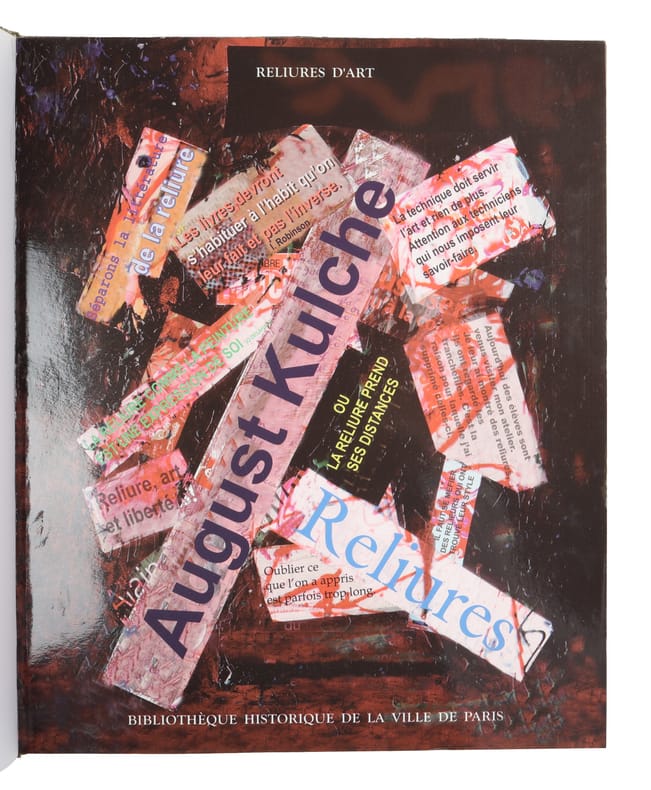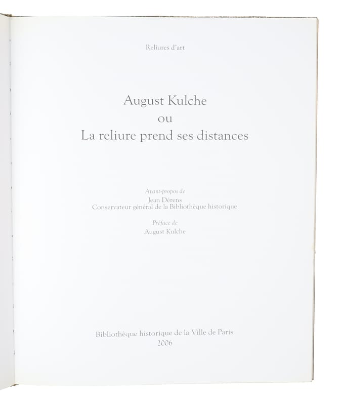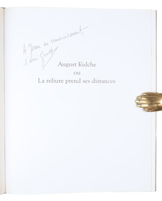 Presentation-copy for Jean Dérens, inscribed and signed by Kulche, of the catalogue of Kulche's book-bindings, bound in an outright magnificent, modern book binding in Kulche's signature over-the-top-style. The Belgian master bookbinder August Kulche (1927-2003) has contributed to the development of the modern bookbinding for nearly a lifetime. With his life and work, he embodies the ideals and changes that have taken place in bookbinding since the mid-20th century, and his influence reached far beyond Belgium and Frace, where he practiced. His bookbinding expression is unique and novel, and he will no doubt continue to influence new generations of bookbinders even after his death. He was also the teacher of the renowned Belgian bookbinder Edgard Claes.