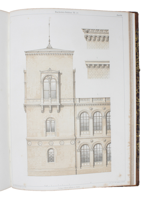 Berlin, 1863. Folio. Cont. hcalf. (108) pp. of text with many woodcut illustrations and 85 fine lithographed plates in colours, depicting details of bricklaying, patterns, houses etc. etc. Some plates slightly brownspotted.