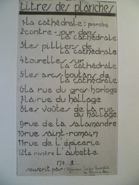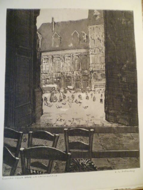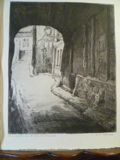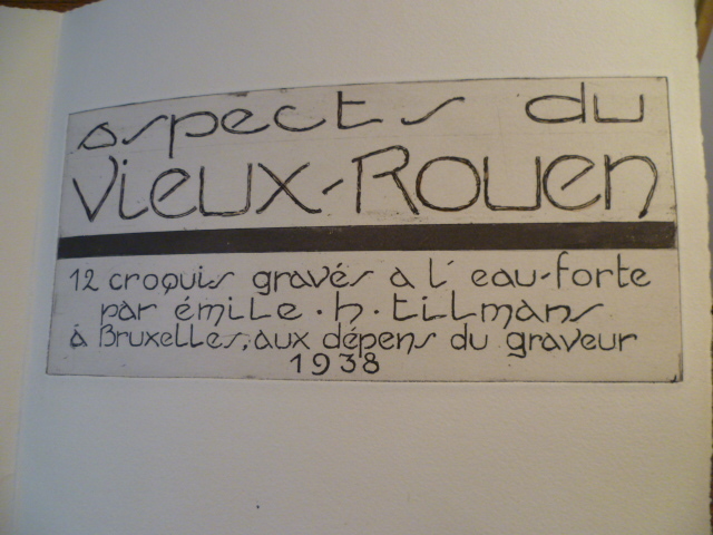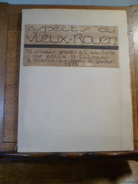 A Bruxelles, aux dépens du graveur, 1938.Un volume (26 x 34 cm) en feuilles, sous chemise à rabats d'édition. Chemise légèrement brunie et poussiéreuse, défaut en queue du dos. Mais intérieur en parfait état.Album peu courant, complet du titre, de la table et des 12 gravures, toutes signées et titrées à la mine de plomb. Tirage non justifié. Numéro 1 pour Jules Grosfils, enrichi d'un dessin original signé, à l'encre de Chine et lavis d'encres noire et sépia figurant un coin de ville. Outre la rue du Gros-Horloge et divers aspects de la cathédrale, les planches figurent la rue du Hallage, la rue de la Salamandre, la rue Saint-Romain...E.H. Tielemans (ici orthographié "Tilmans") est l'un des cofondateurs de "La Gravure originale belge" dont J. Grosfils était le président.