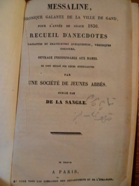Se trouve à Paris et chez tous les libraires des départements et de l'étranger. Sans date. Un volume relié in-12 (11 x 17,5 cm) de 63 pages. Reliure plein skyvertex bordeaux, pièce de titre verte. Un léger manque au coin bas de la page de titre, quelques rousseurs sinon bon exemplaire. Édition originale de cet ouvrage graveleux. "Plusieurs personnages de Gand qui étaient connus par leur galanterie y sont cités par les initiales de leurs noms" (Vanderhaeghen, V, 431-32). L'auteur fut condamné, le 19 août 1836, à un an d'emprisonnement. Rare.