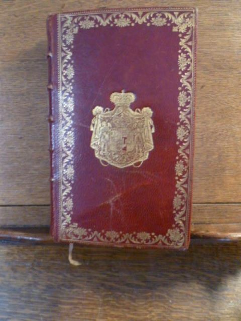 A Paris, par la Société, [1747].Un volume relié 10,5 x 17,5 cm) de [16]-728 pages. Reliure d'époque plein maroquin rouge, dos à nerfs caissons ornés de motifs floraux, titre doré, blason central doré sur les plats, plats encadrés de filet et de motifs floraux, tranches dorées. Légères traces de frottements sinon très bel exemplaire.Aux armes d'un comte de La Tour d'Auvergne. Comportant deux écussons distincts.