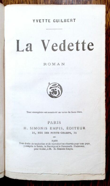 Édition originale, un des 70 exemplaires numérotés sur papier de Hollande. Premier roman de la célèbre interprète plusieurs fois représentée par Toulouse-Lautrec (2 images jointes). Bon etat