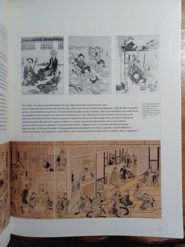 Edition rare en second tirage, qu'on peut traduire sous le titre de Croquis de Hokusaï, volume 9. 15 volumes ont effectivement paru couvrant l'oeuvre de Hokusaï. Le premier fut publié en 1814 et les derniers à titre posthume en 1878. Le volume final est considéré comme apocryphe par certains historiens de l'art. le Volume contient environ 40 sujets, la plupart sur double page en noir, gris et chair. Il est essentiel d'ajouter qu'on ne saurait déterminer avec certitude s'il s'agit du premier tirage ou d'un tirage plus tardif, car sur ce sujet, il n'y avait pas de différence pour les Japonais, et l'éditeur réimprimait des volumes au besoin, la notion de premier tirage n'étant pas pertinente au regard du livre japonais. On sait par contre que l'éditeur effectua un second tirage de ce livre entre 1828 et 1878.Les tirages plus tardifs n'ont pas le même nom d'éditeur et possèdent souvent une date, ce qui n'est pas le cas des tirages plus anciens. Volume en accordéon, relié par une couture. couverture grise à losanges avec étiquette de titre et écriture en rouge sur fond blanc. Très bon exemplaire, bien frais. Les hokusaï manga traitent de sujets variés, des scènes de la vie quotidiennes, mais aussi des scènes guerrières, également des scènes de légendes typiquement japonaises, des animaux et des fleurs et des paysages, animés ou nom, notamment le mont Fuji. On considère en général que, après une période de production intense, Hokusai sélectionna très soigneusement ses croquis, et en redessina même un certain nombre, en les disposant selon l'ordre que nous connaissons aujourd'hui. Cependant, Michener soutient que la mise en page des différents croquis sur une planche donnée a été en réalité décidée par les graveurs et les éditeurs, et non par Hokusai lui-même. On rappellera que la technique de l'estampe japonaise est très proche du dessin original, puisqu'on apposait le dessin à l'encre sur un pièce de bois que le graveur creusait, suivant précisément les lignes du dessin, lui-même détruit par cette opération. Ce volume contient de nombreux paysages animés, des scènes guerrières, - Photographies et détails sur www.Edition-Originale.com -